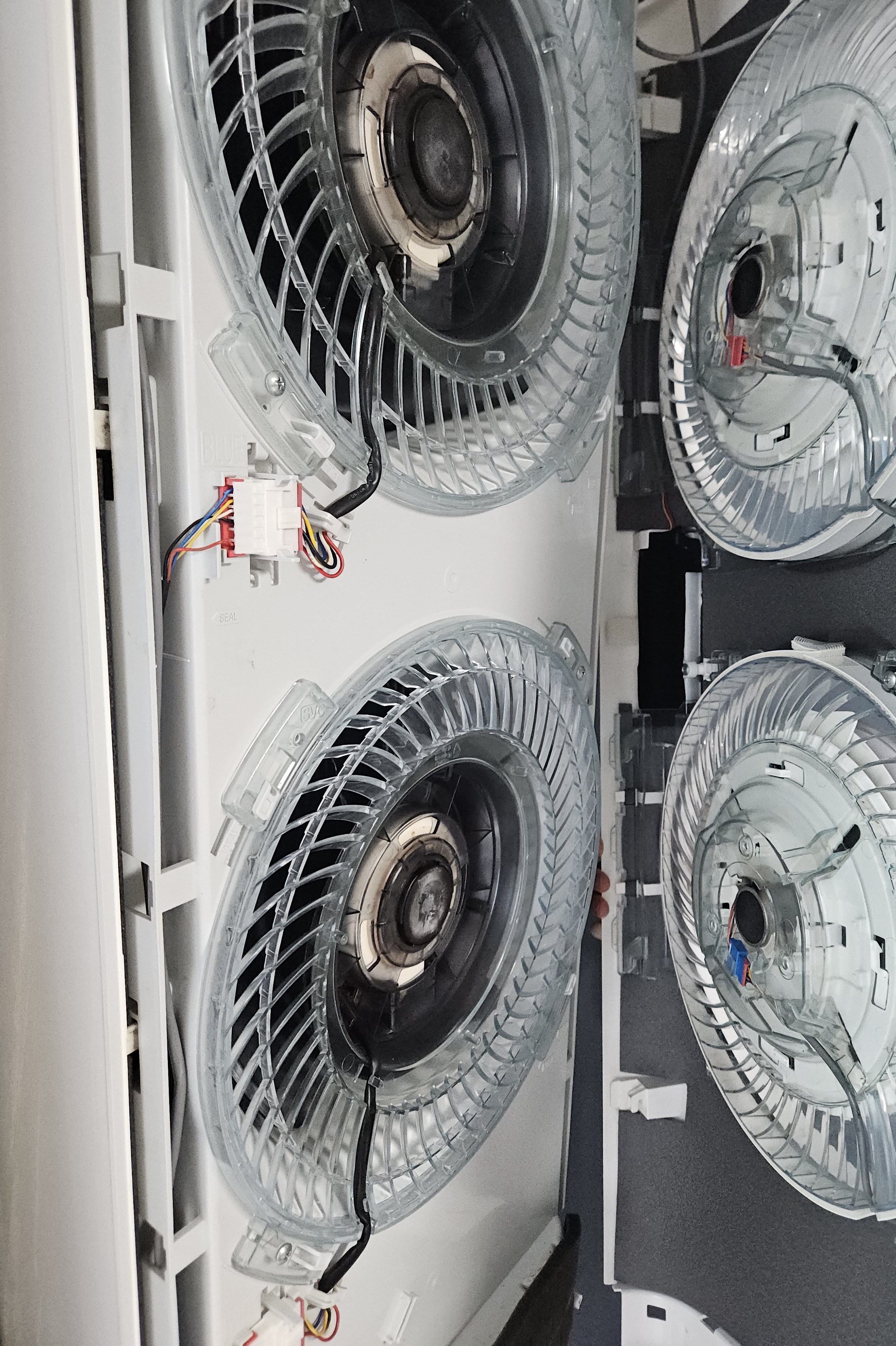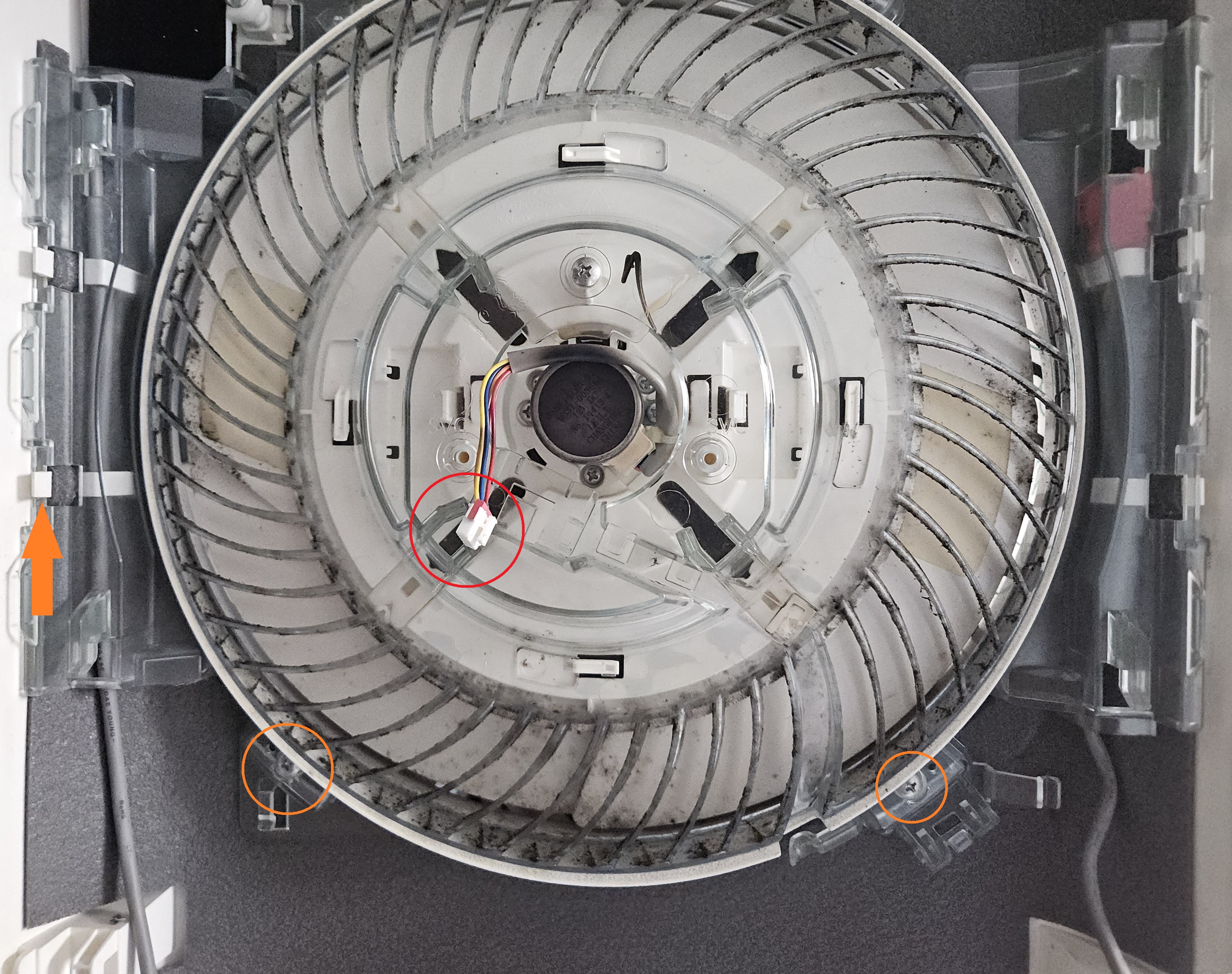 안에서 송풍을 해주는 팬(aka 선풍기)을 탈거하기 위해 같은 방식으로 커넥터를 분리한 후 나사를 두 개 풀어주고 화살표 방향으로 팬을 회전시키면 팬의 탈거가 가능합니다.