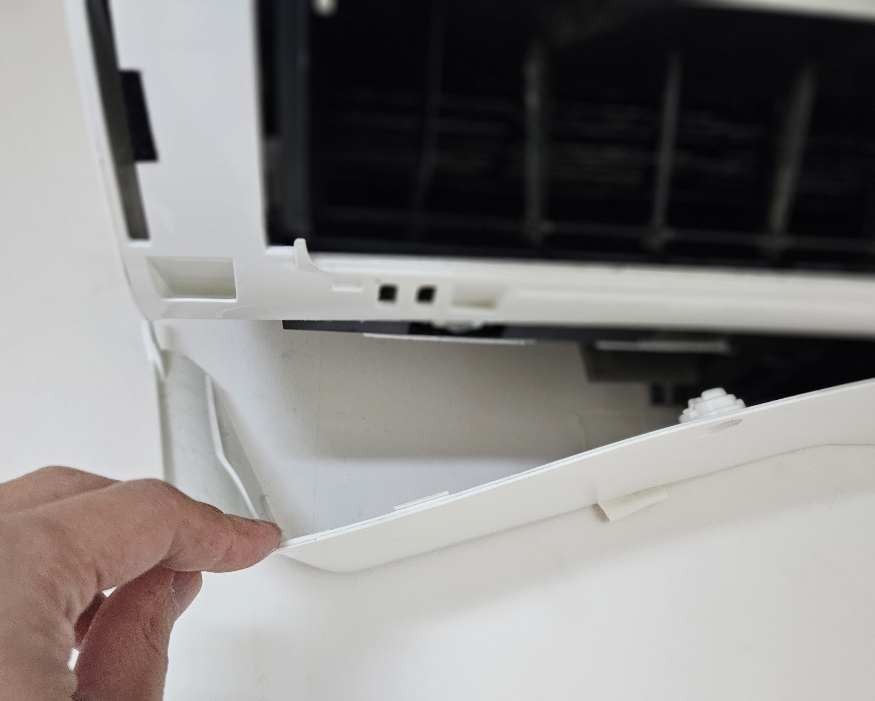 리모컨 수신부의 기판 때문에 세척이 어려우니 검은색 덮개 부분을 위의 걸쇠 부분을 눌러 탈거해 줍니다.