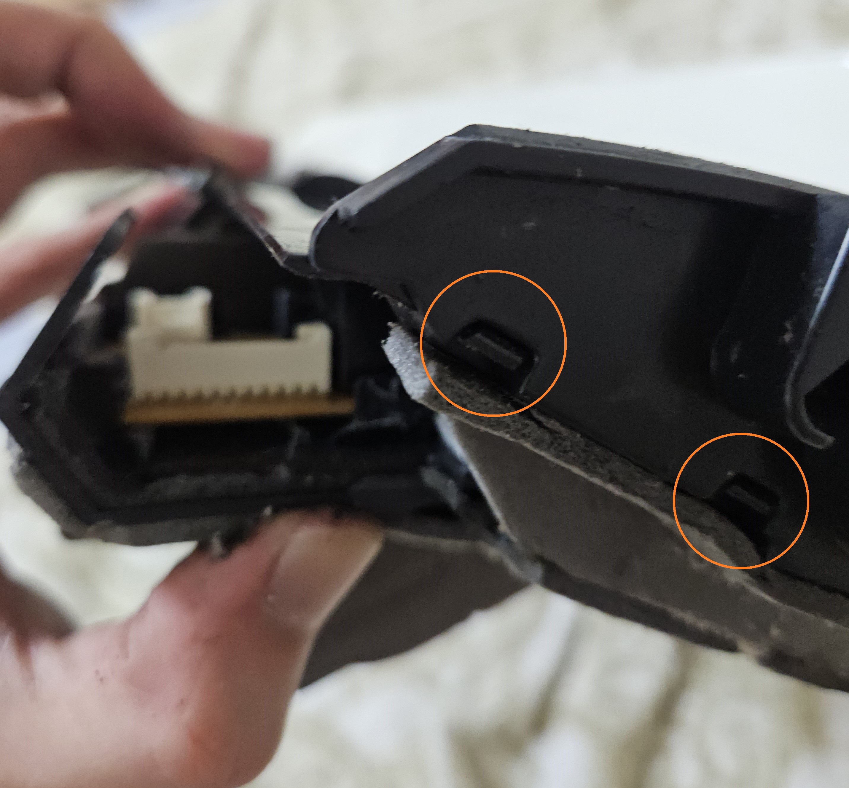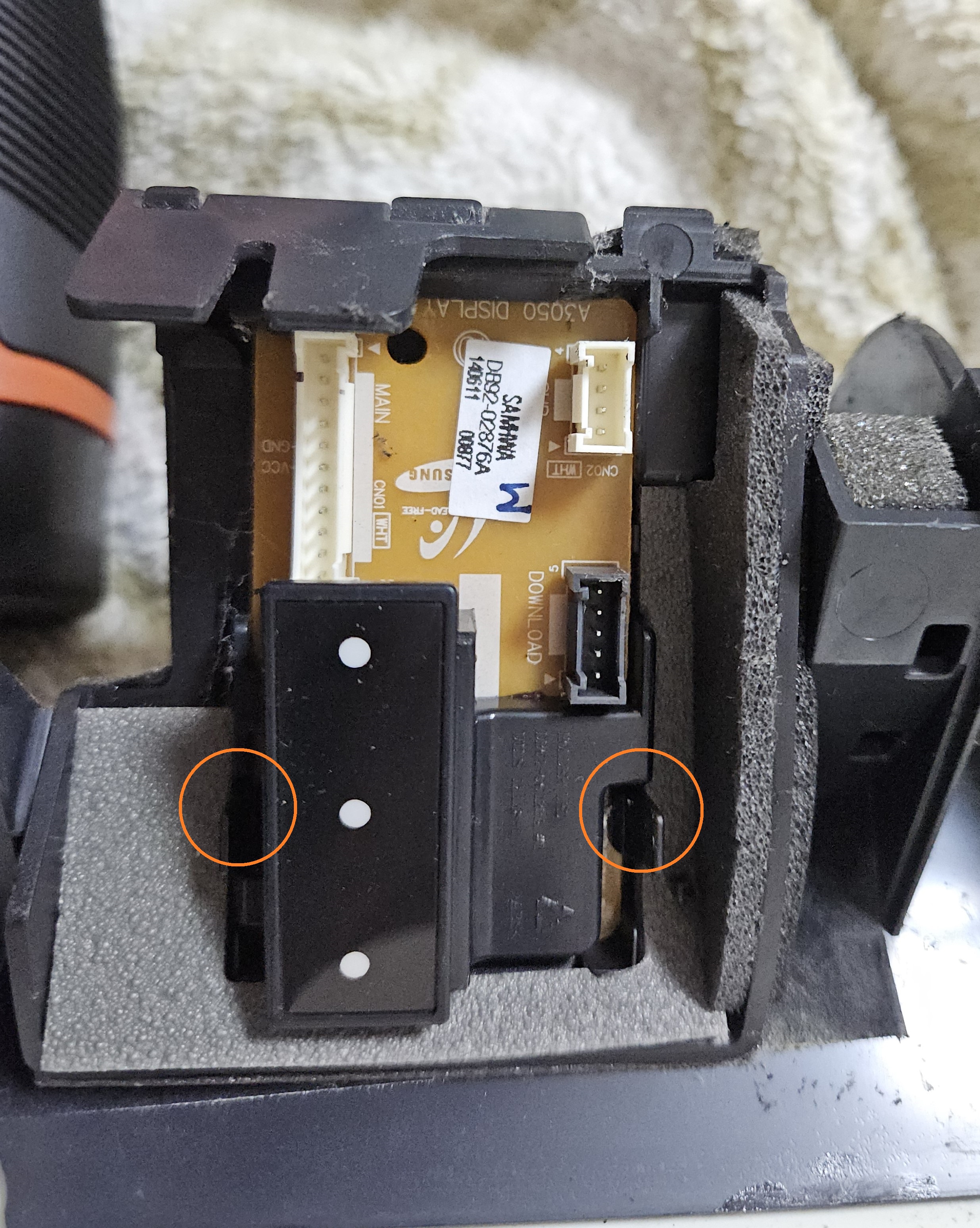 기판이 노출되면 위 사진의 걸쇠 두 개를 바깥쪽으로 밀어주면 기판을 탈거할 수 있습니다.