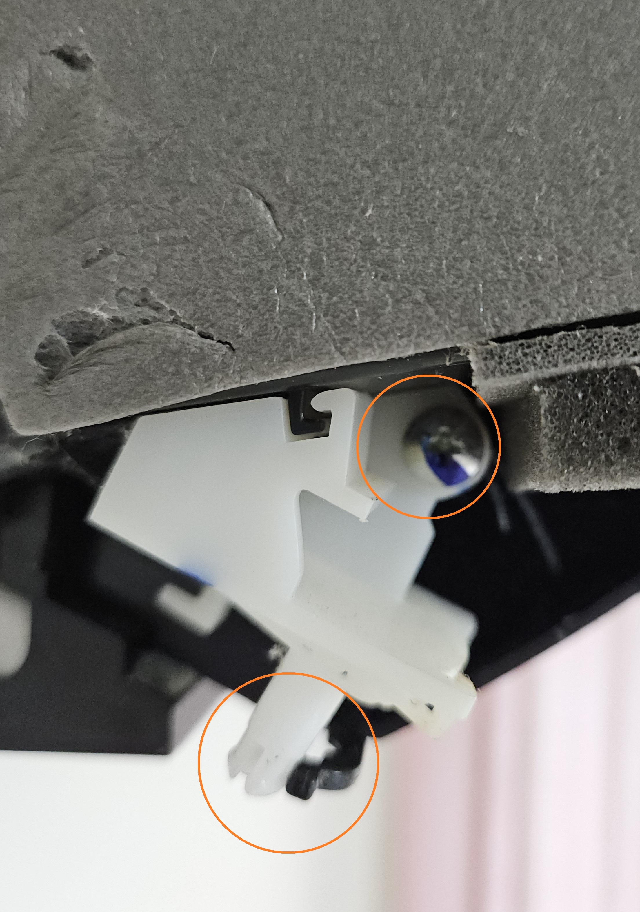 바닥부의 마감재도 위에서 나사를 푼 후 살살 뜯어내면 되는데... 1/3 정도 지점마다 뒤에 두 사진처럼 걸리는 부분이 있습니다.