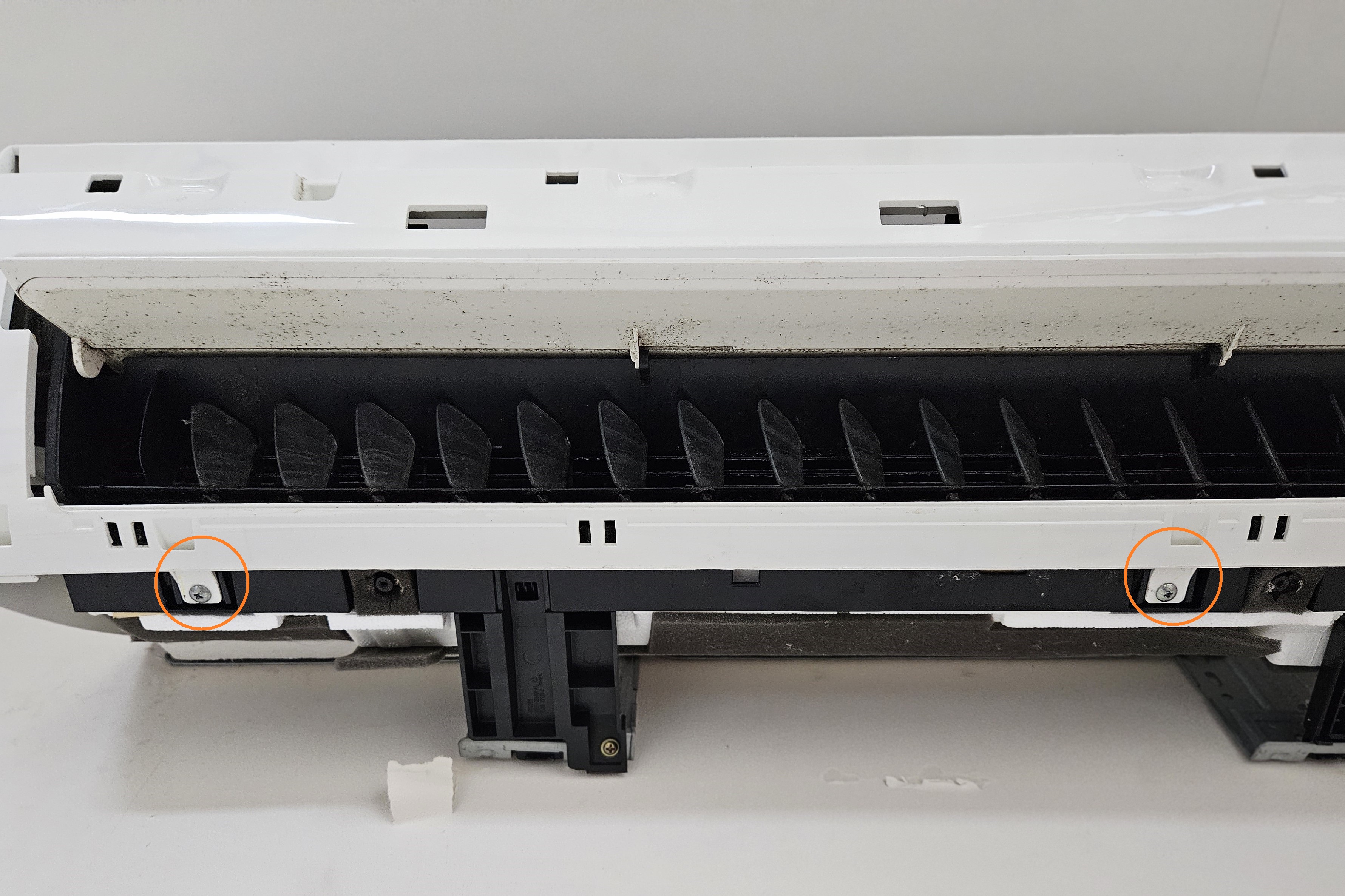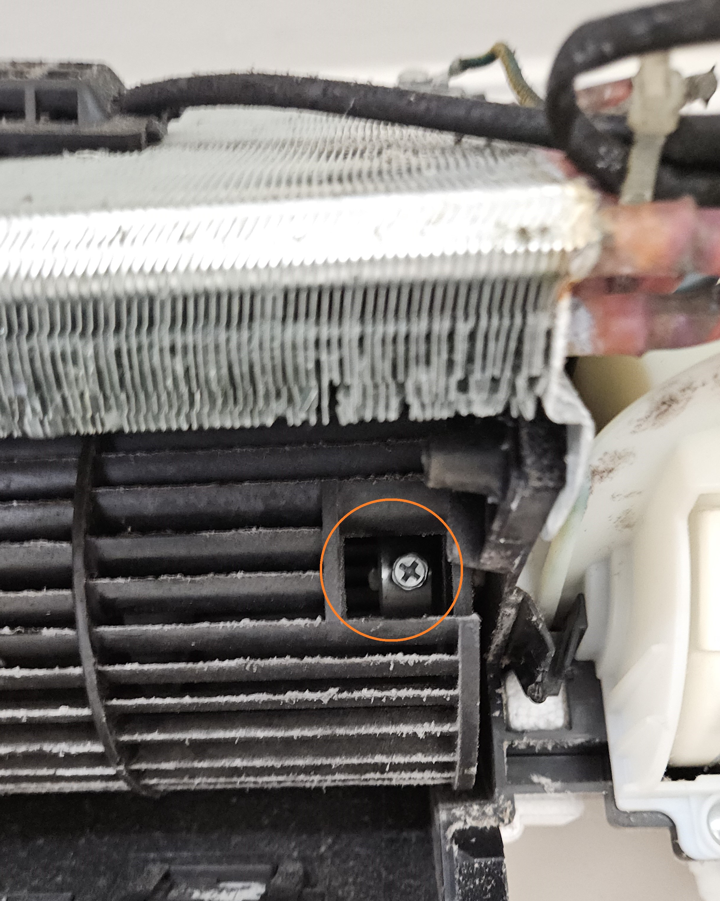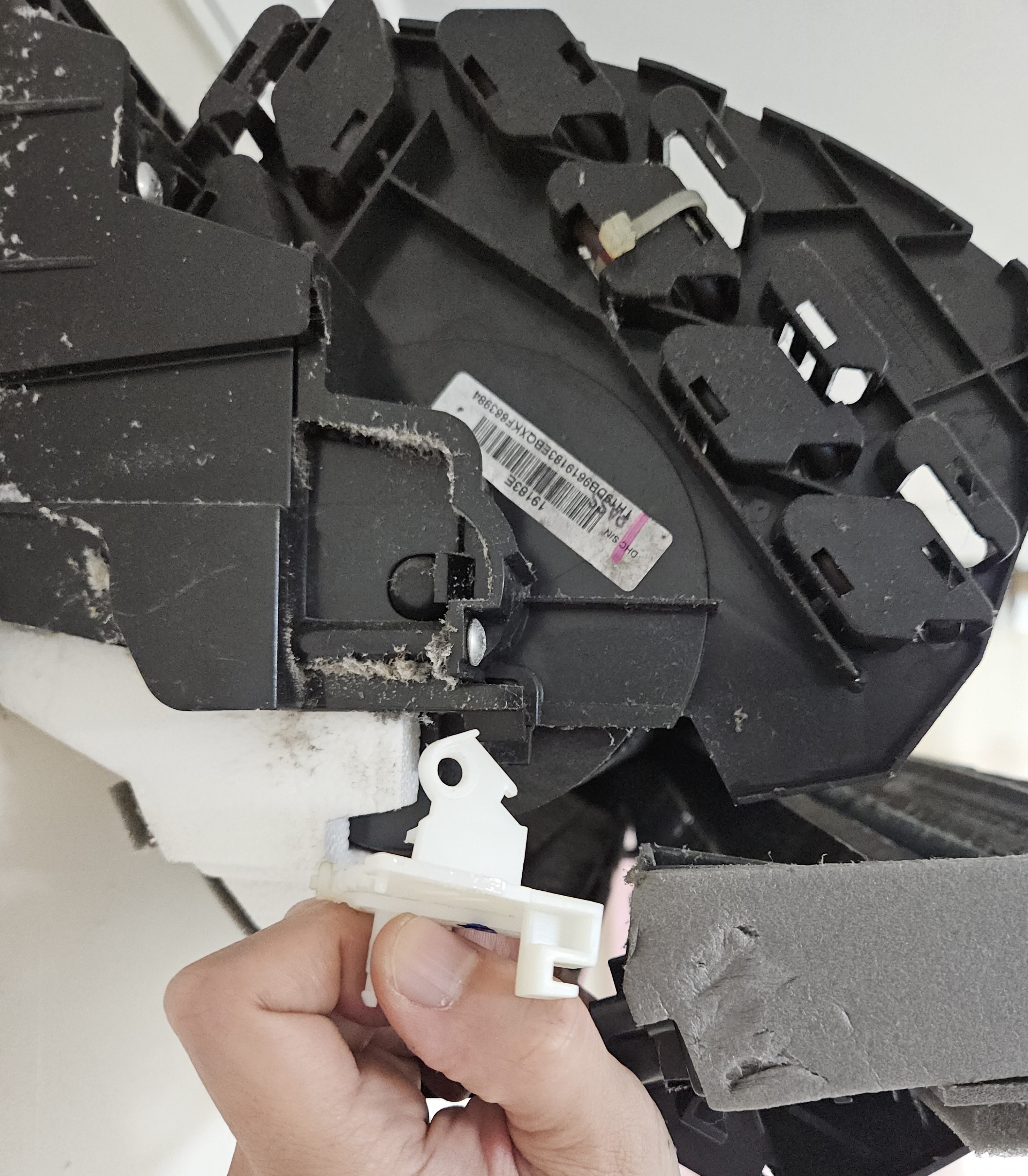 좌우방향의 바람을 결정하는 날개를 탈거하기 위해 왼쪽에서 먼저 날개를 움직이게 해주는 걸쇠 부분을 손으로 탈거한 후, 나사를 하나 풀고, 지면에서 수평방향으로 하얀 부품을 당기면 해당 부품이 탈거됩니다.