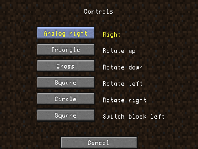 아쉬운 점은 하나 더 있는데... PSP용 마인크래프트인지라 기본 키 설정에 PSP에는 없었던 오른쪽 아날로그 키를 할당할 방법은 없습니다.