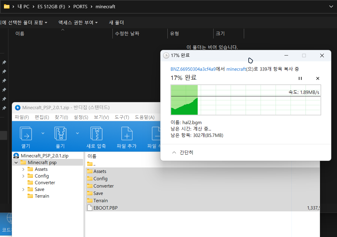 생성한 폴더에 위에서 내려받은 압축 파일 내의 'Minecraft_PSP_2.0.1.zip' 파일을 압축해제한 후 나오는 모든 파일과 폴더를 복사해 줍니다.