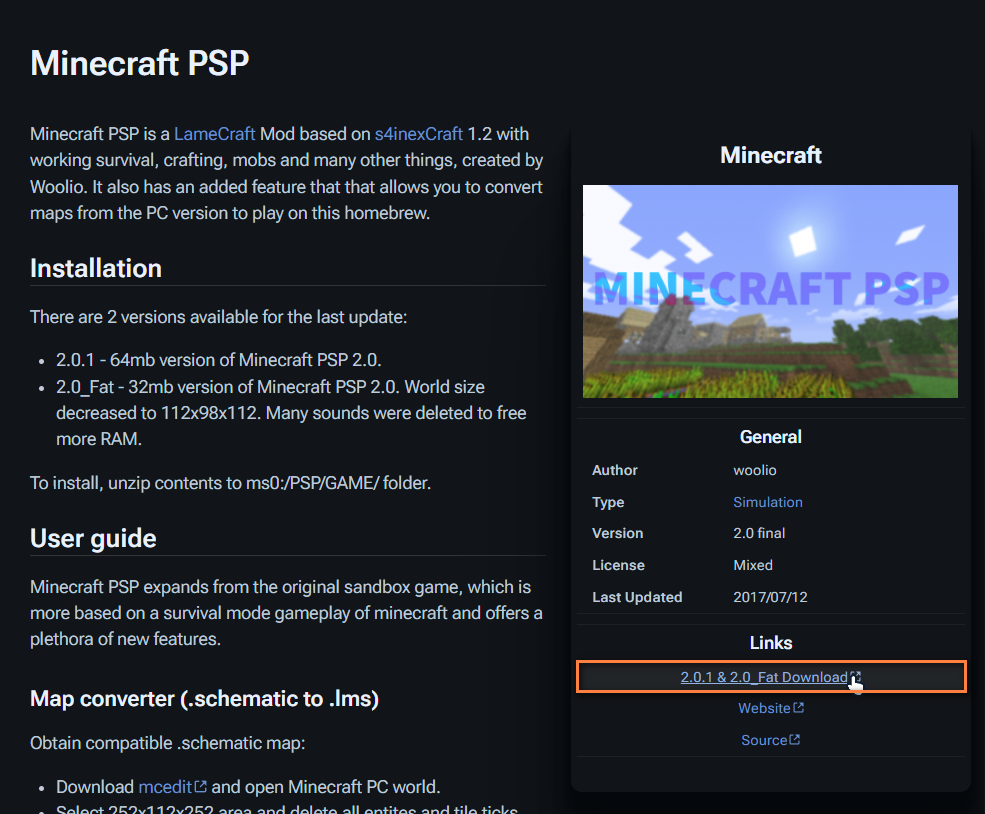 PSP용으로 포크 된 마인크래프트를 내려받기 위해 위의 바로가기를 방문해 줍니다.