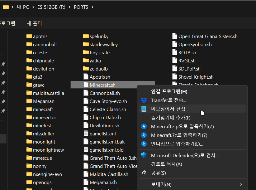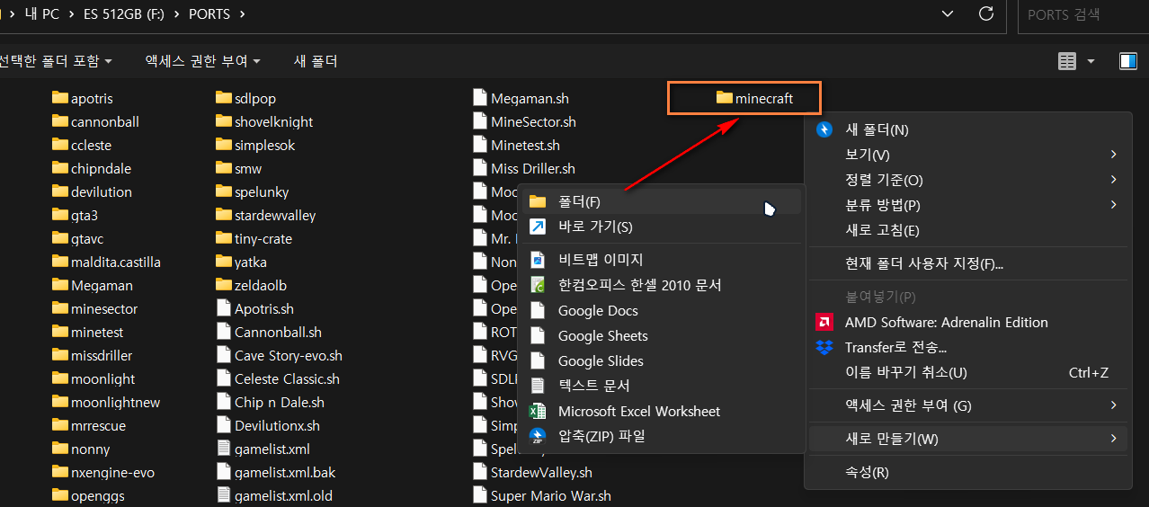 기기의 게임용 롬파일이 들어있는 SD 카드를 PC에 삽입한 후 'PORTS" 폴더 하위에 'minecraft' 폴더를 생성해 줍니다.