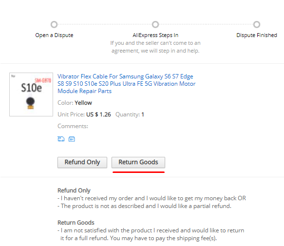 'Refund Only'는 물품을 받지 못하였을 경우 환불만 진행하는 것이고 'Return Goods'는 받은 물건에 하자가 있는 등의 경우 반품 후 환불을 진행하는 것입니다.