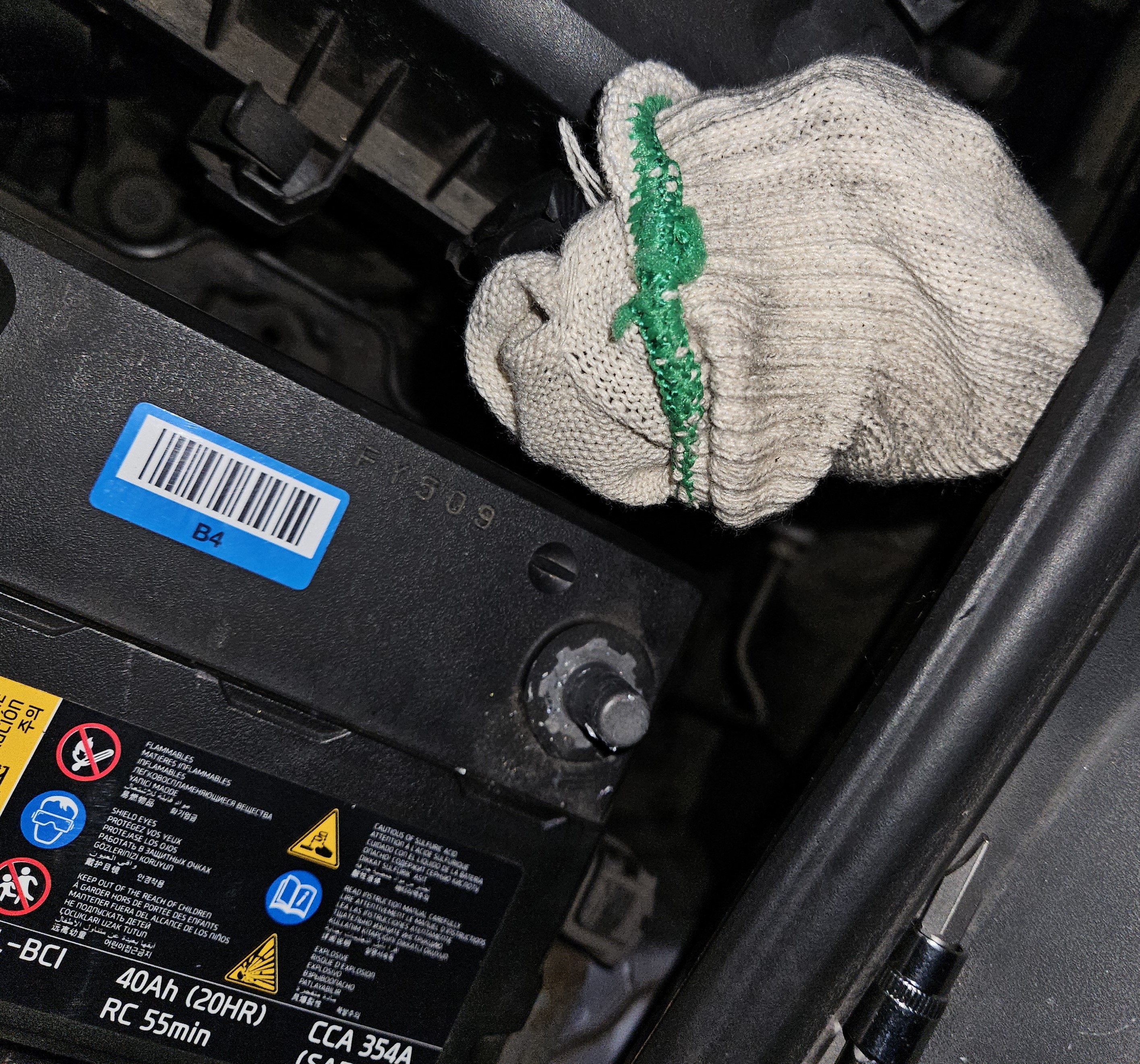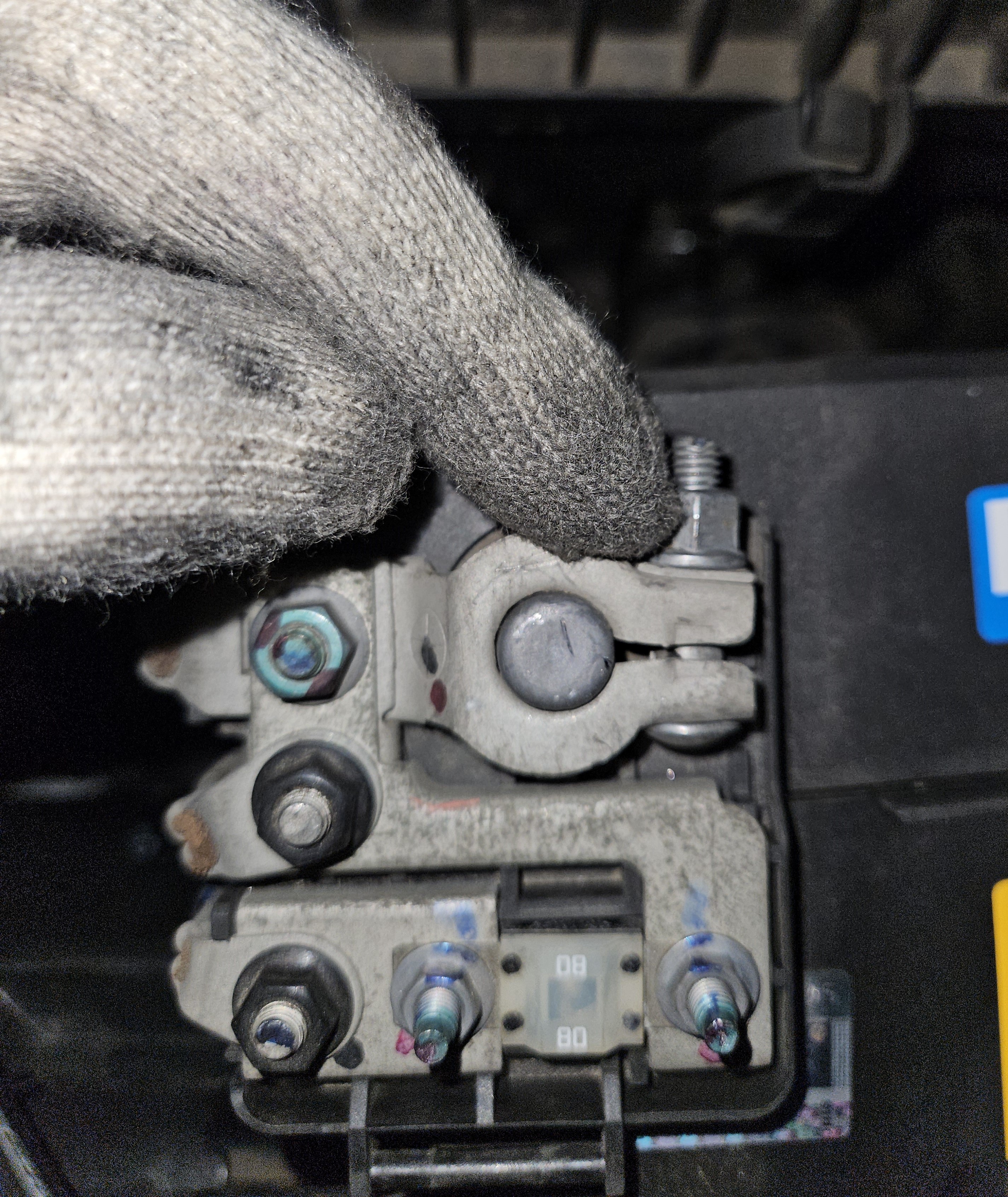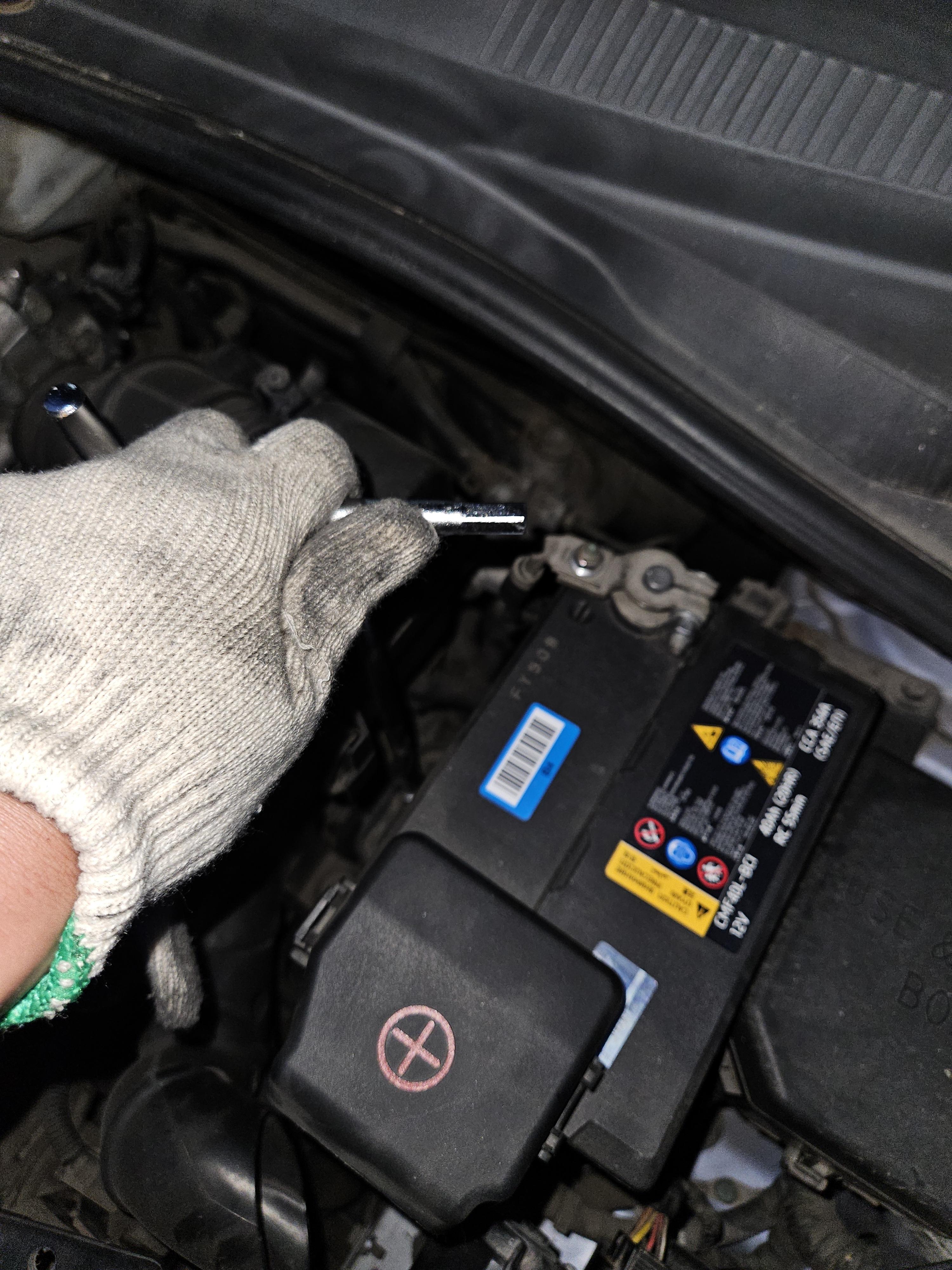 커버가 덮여있지 않은 단자가 음극 단자로 10mm 너트를 좀 풀어준 후 배터리 단자를 탈거하고는 사고를 예방하기 위해 목장갑등으로 전극을 감싸줍니다.