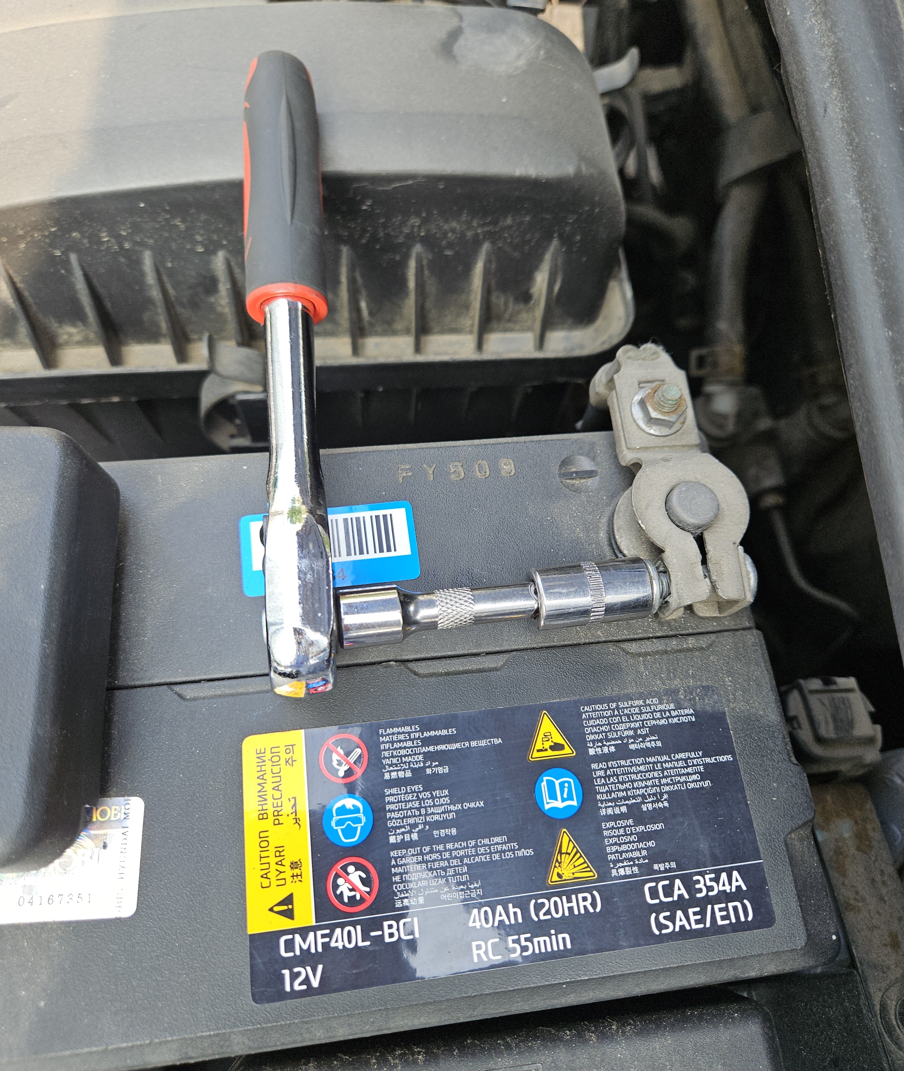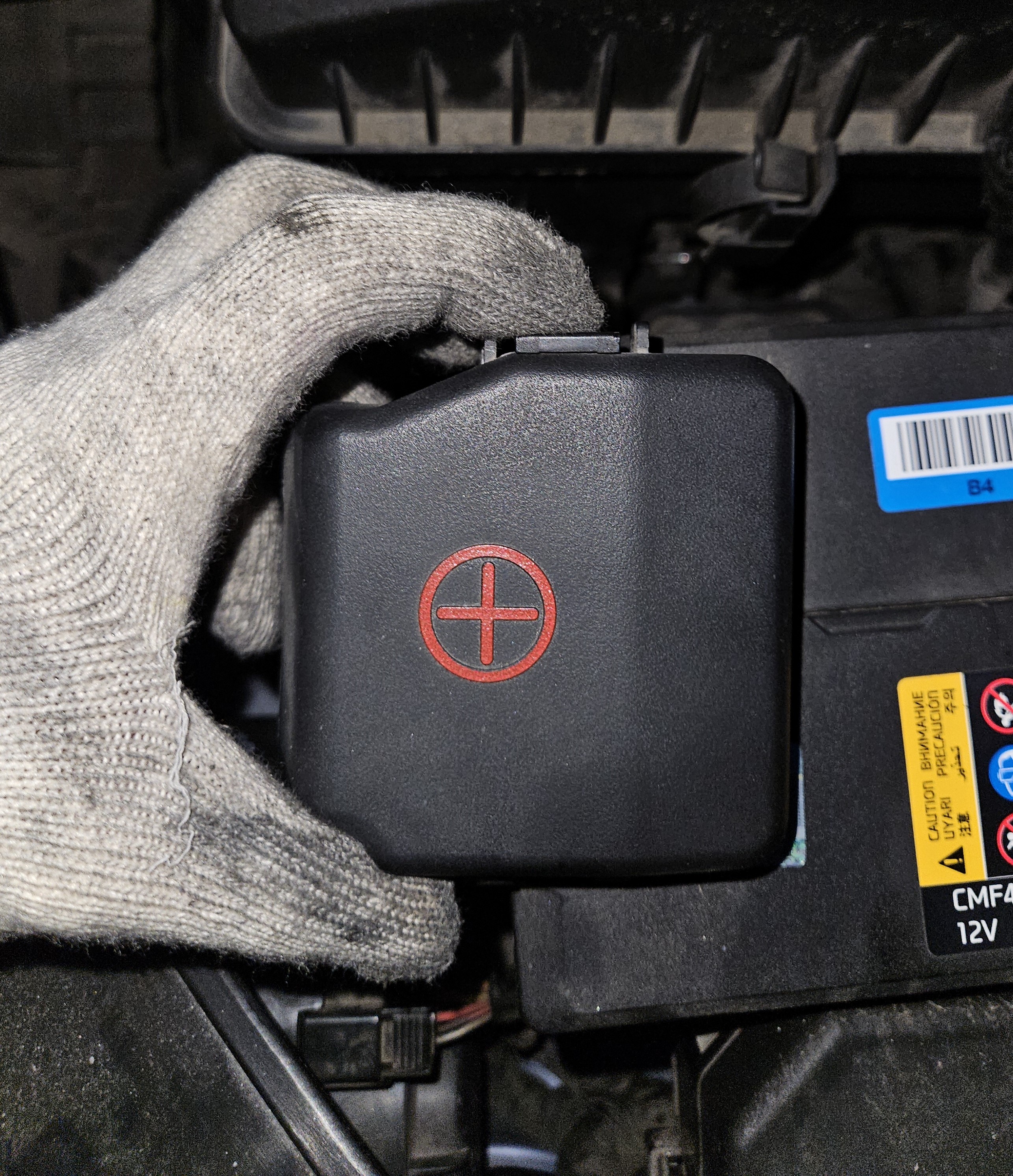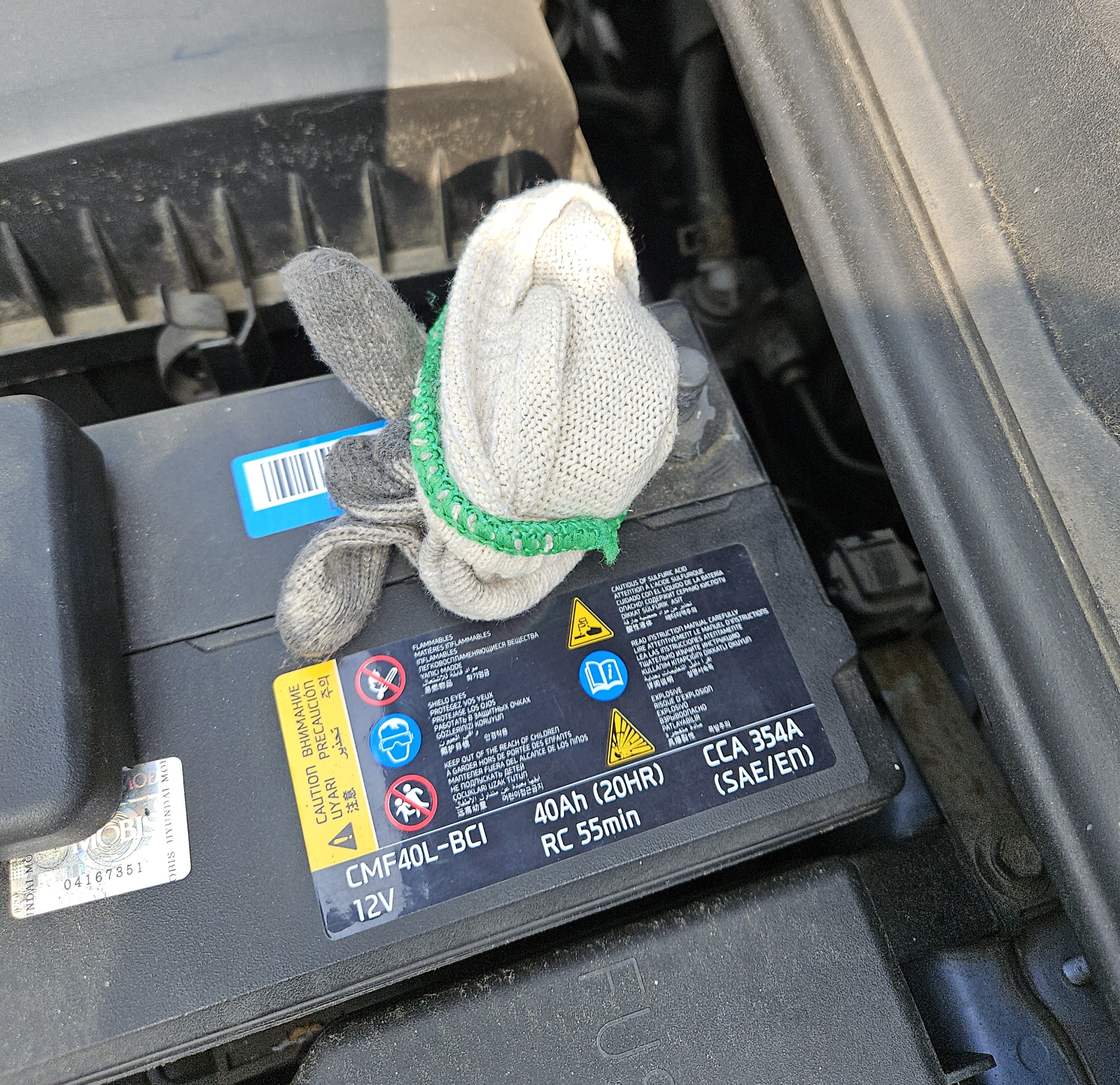 커버가 덮여있지 않은 단자가 음극 단자로 10mm 너트를 좀 풀어준 후 배터리 단자를 탈거하고는 사고를 예방하기 위해 목장갑등으로 전극을 감싸줍니다.