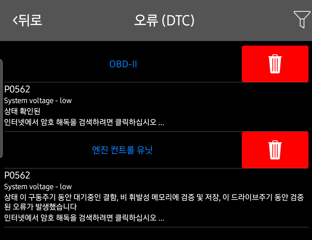 배터리 교체 후 해당 경고를 소거하고 나니 이제 다시 엔진경고등이 점등되지 않습니다.