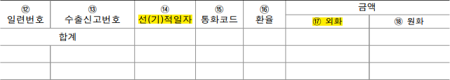 ⑱:⑰란의 금액을⑯란의 환율로 곱한 환산금액 또는 선(기)적일 전에 수출대금(수출선수금, 사전송금방식수출 등)을 원화로 환가한 경우에는 그 금액을 원단위 미만은 절사하고 적습니다.