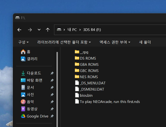 SD 카드에 저렇게 폴더가 생성되었는데, 대충 보아도 DS, GBA, GBC, NES의 롬파일을 지원할 것 같아 각각의 폴더에 테스트용으로 롬파일을 넣어주었습니다.