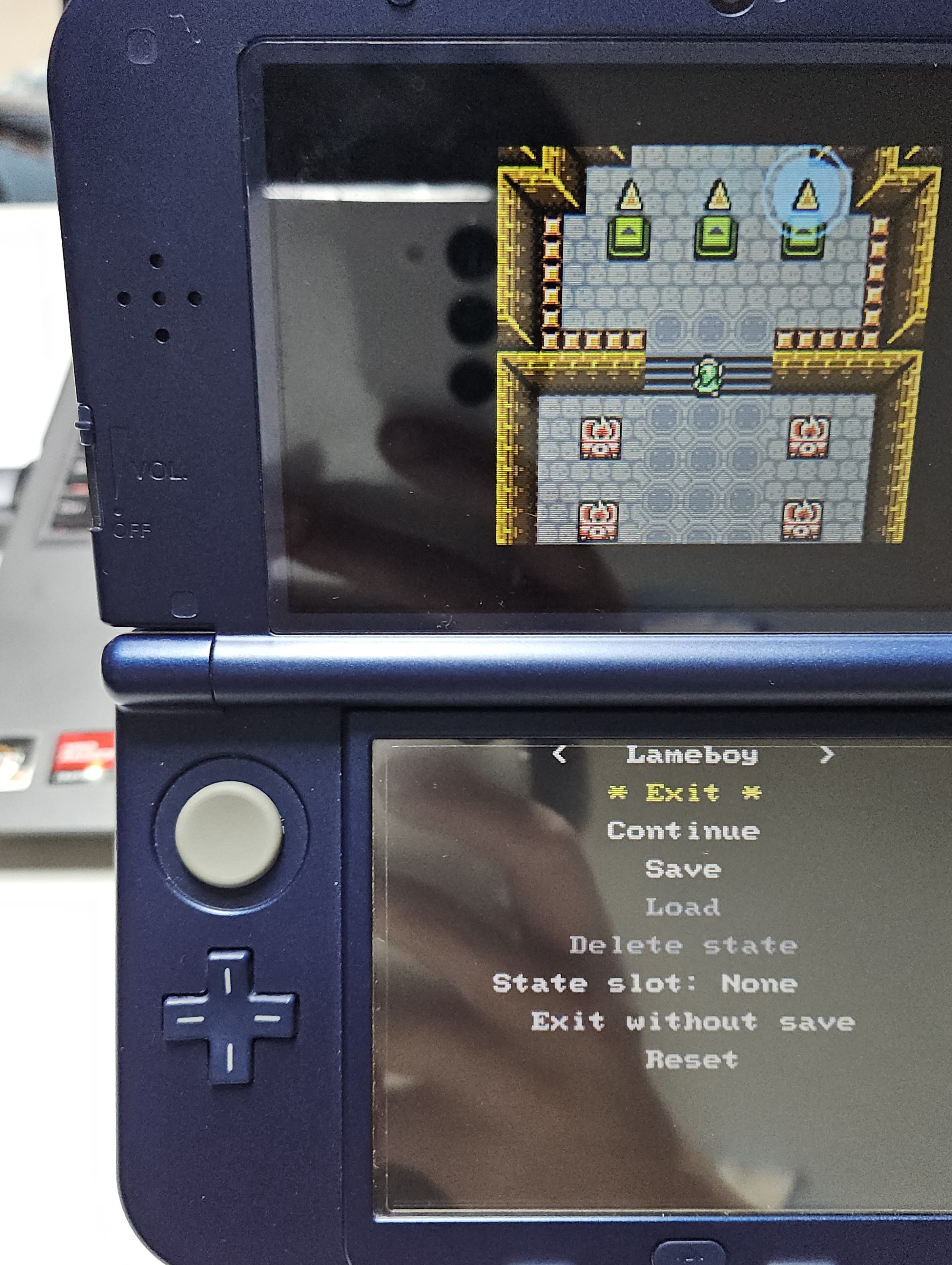 롬파일을 선택해 보니 잘 구동이 되며 L이나 R키를 누르면 위 갈무리처럼 Lameboy라는 설정 메뉴가 나옵니다.