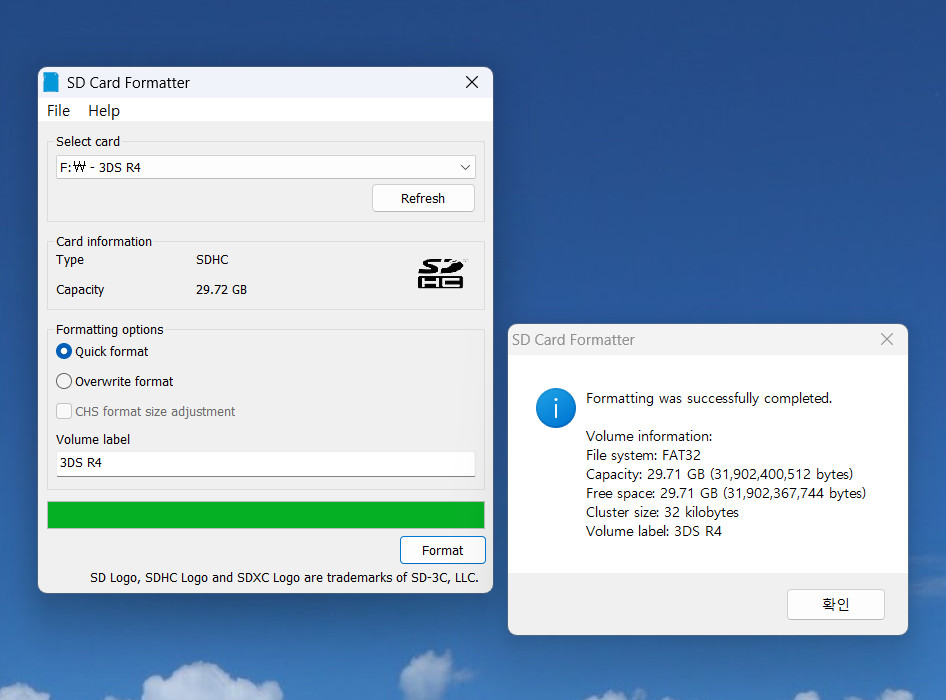 고전게임기용 SD 카드를 사용하다 보면 FAT32 형식을 아직도 사용할 일이 생기는데 윈도우즈 탐색기에서 제공하는 기본 포맷에서는 대용량의 SD 카드의 포맷 형식을 exFAT이나 NTFS만 지원합니다.