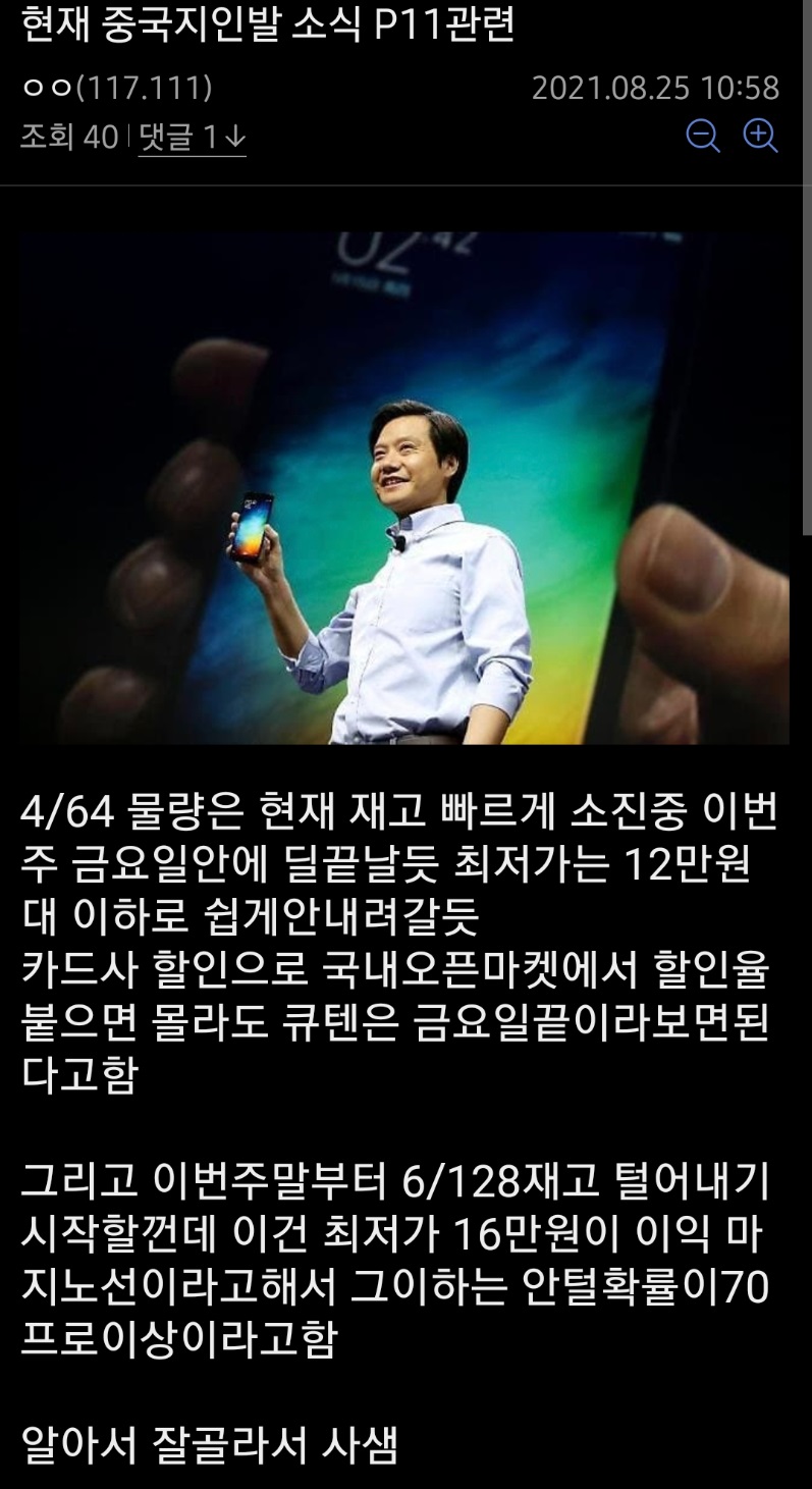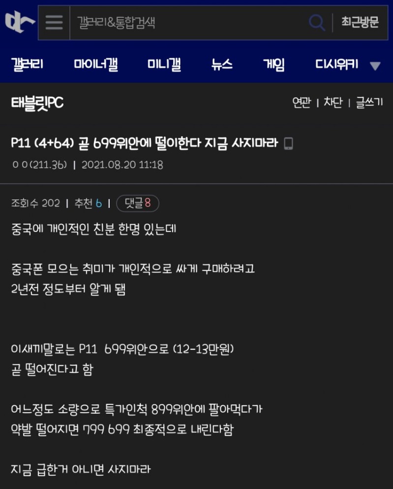 얼마전 P11 가격의 떡락을 예고했던 디씨인사이드의 게시물로 보아 여기가 발목은 아니더라도 발목과 무릎 사이 정도는 된다 판단했습니다.