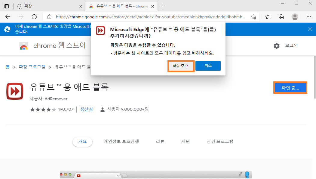 최근의 Edge가 Chrome 브라우저 기반이라 크롬의 확장 프로그램 설치가 가능합니다.