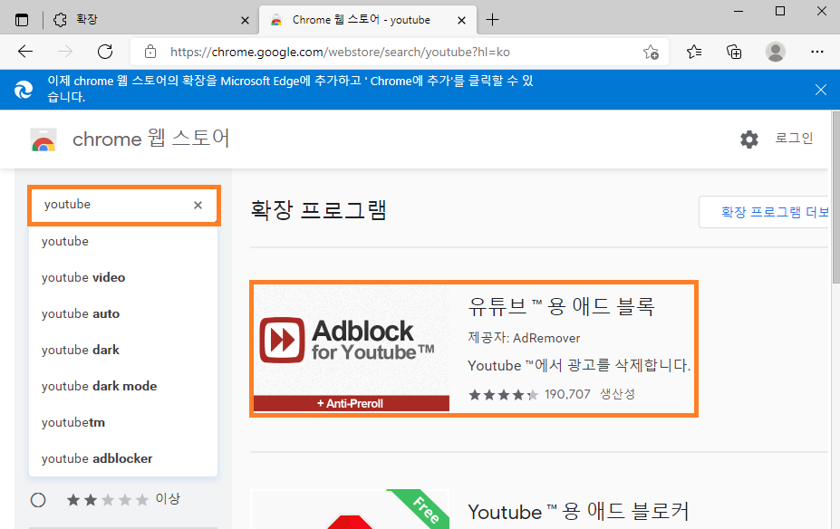 chrome 웹 스토어의 검색창에 youtube를 검색하면 '유튜브용 애드블록' 확장 프로그램이 나옵니다.