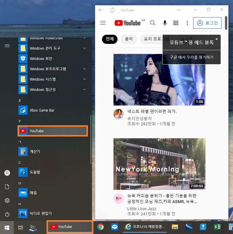 설치가 완료되면 자동으로 유튜브 창이 열리며, 작업표시중에 고정도 가능하고 시작 메뉴에도 별도의 앱이 생깁니다.