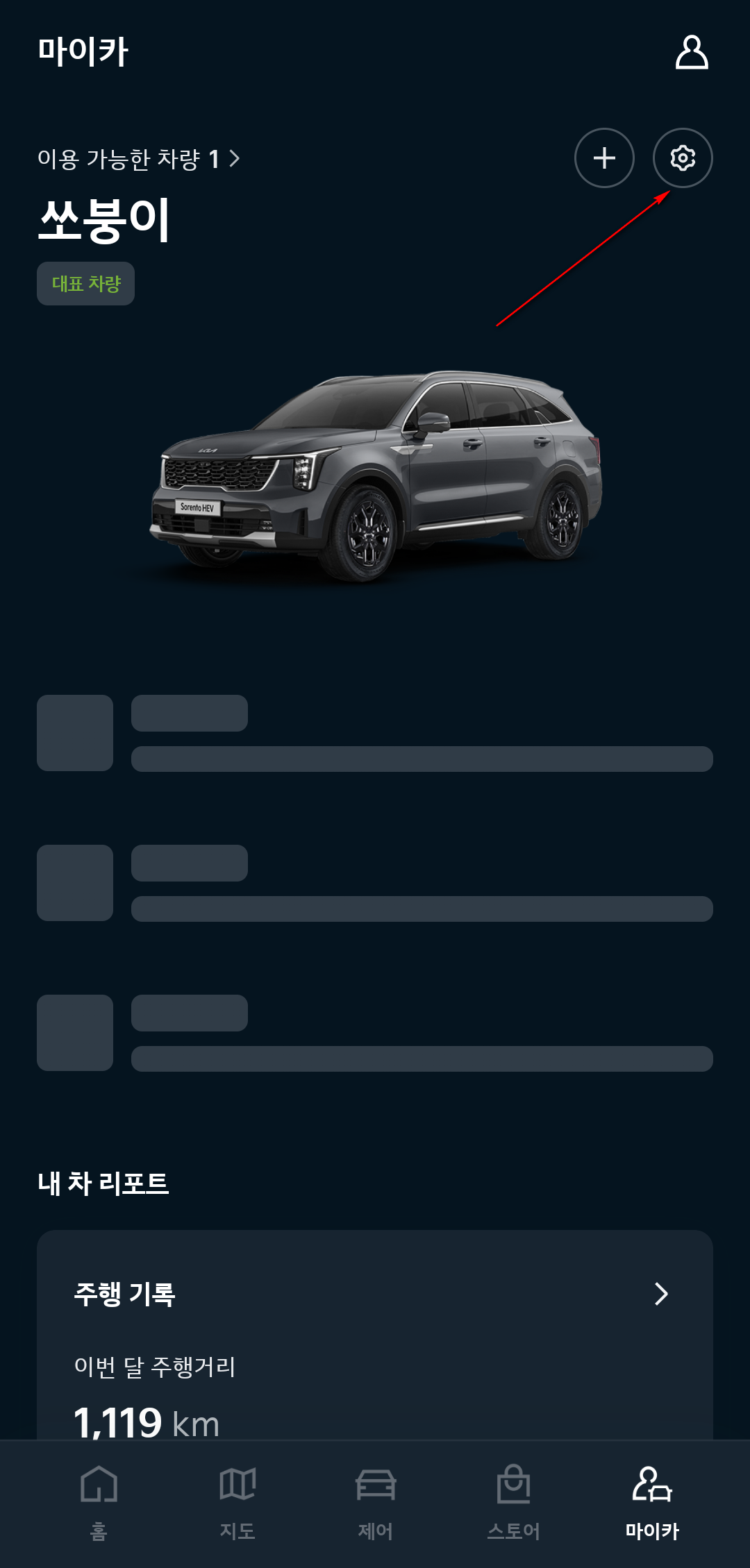 하단의 '마이카' 탭으로 들어가 위의 설정 아이콘을 누르면 '차량 관리' 메뉴로 진입합니다.