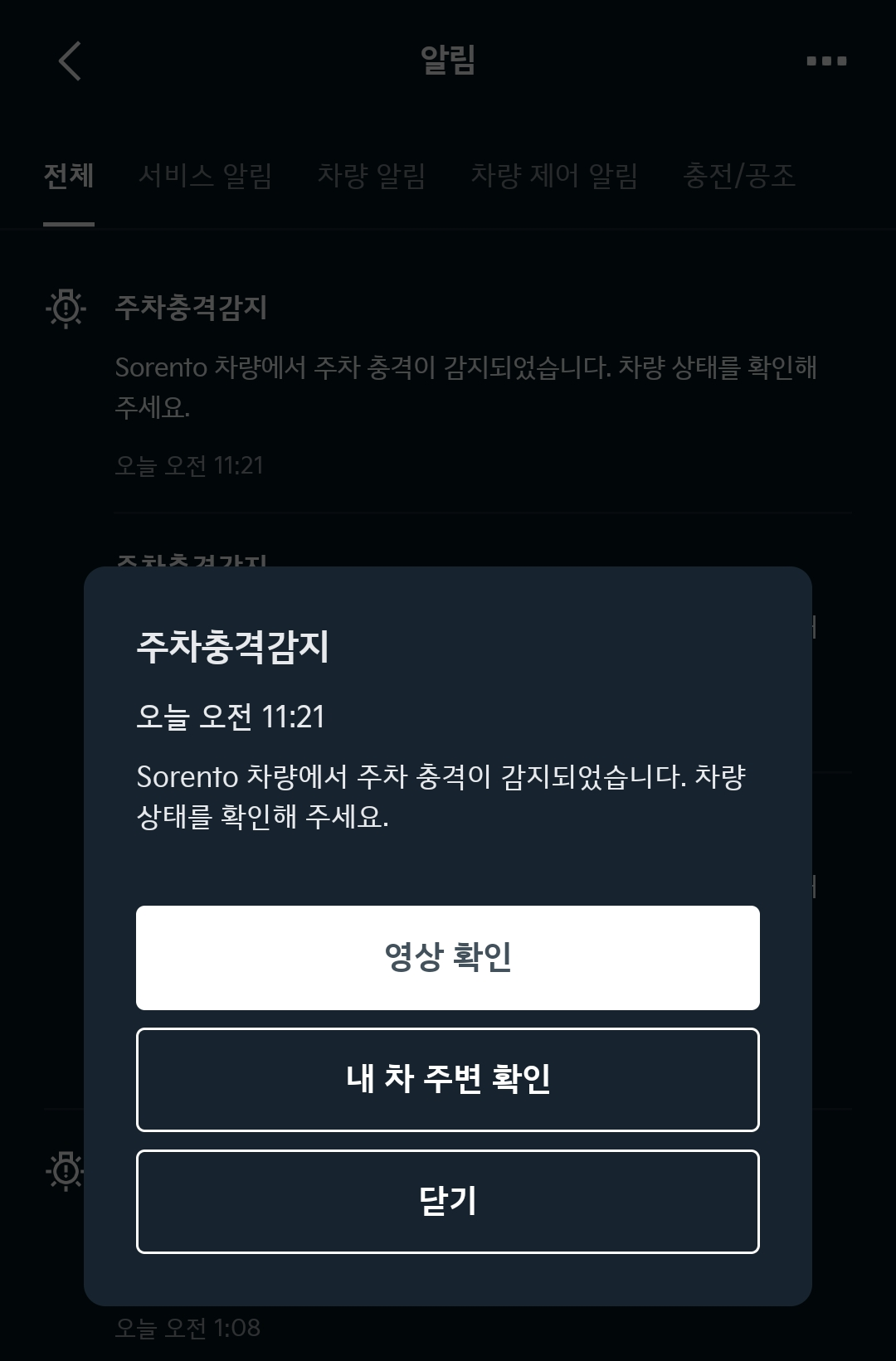 빌트인 캠이 있는 경우 충격감지 시 위와 같이 알림이 옵니다.