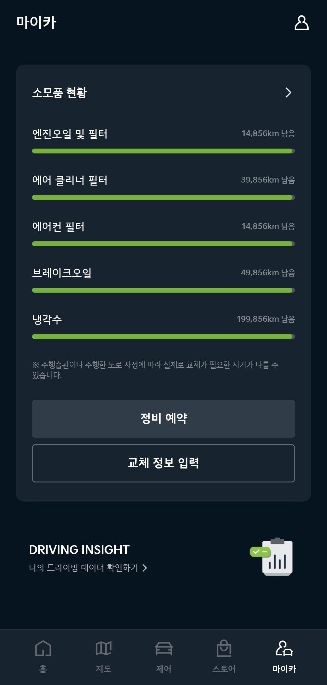 마이카 메뉴에서는 주행 기록과 소모품 교체주기를 확인할 수 있습니다.