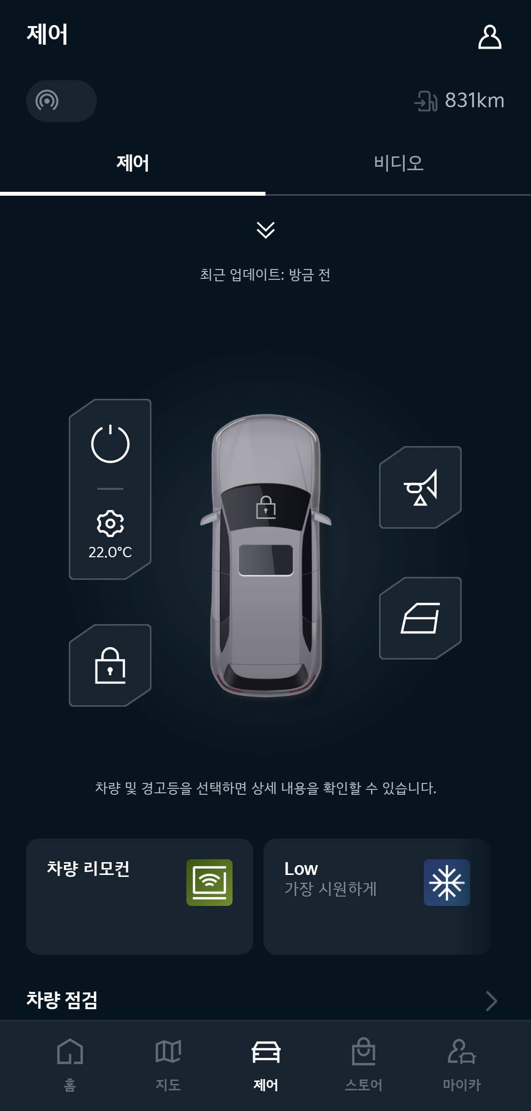 제어 메뉴의 비디오 탭으로 들어가면 빌트인 캠의 녹화가능 시간을 확인하거나 현재 차량 주변의 실시간 영상을 내려받아 확인할 수 있습니다.