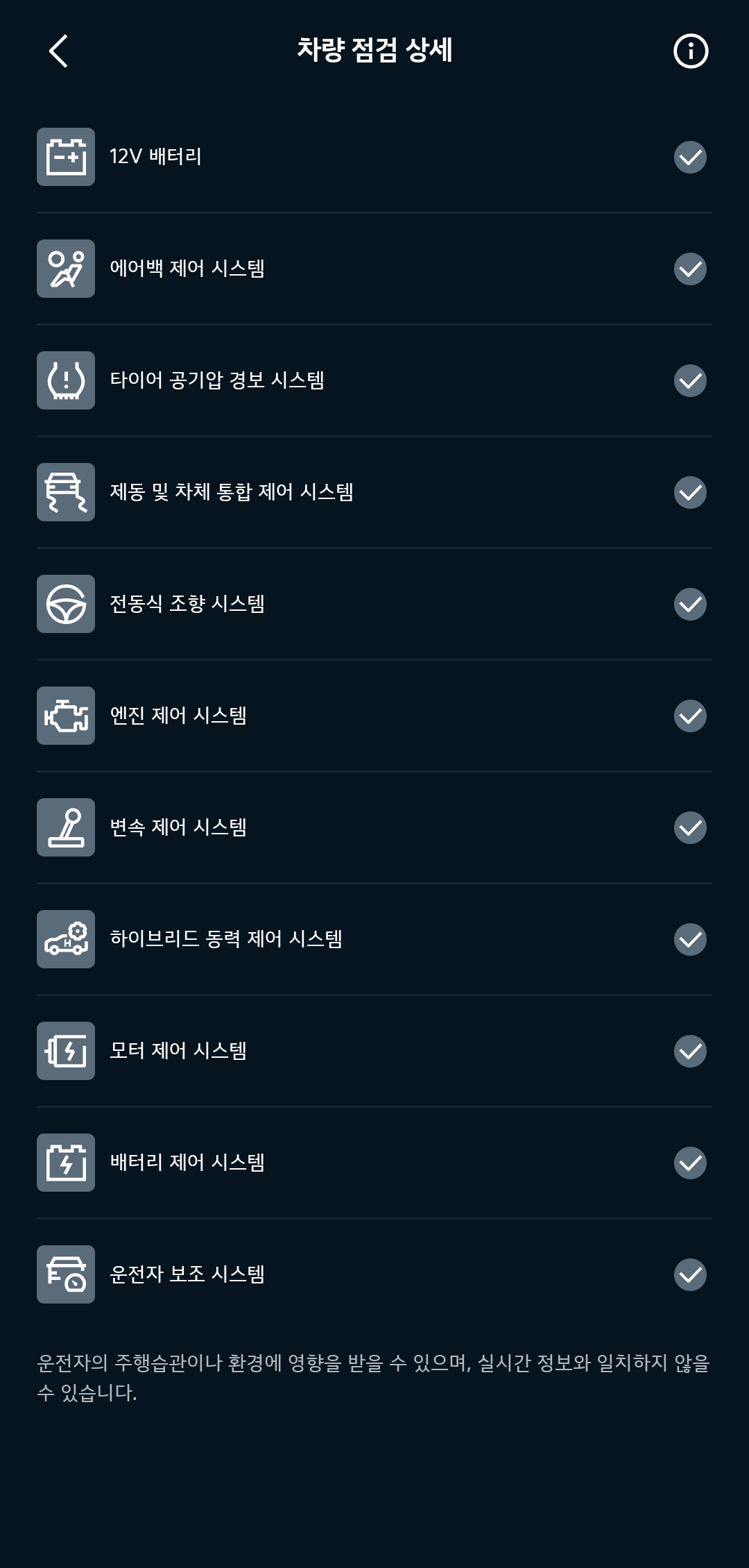 제어 메뉴의 제어 탭 화면 아래에는 '차량 점검'과 '차량 상태' 메뉴가 있는데 '차량 점검'에서는 현재 차량에 이상이 없는지 간단하게 확인할 수 있습니다.