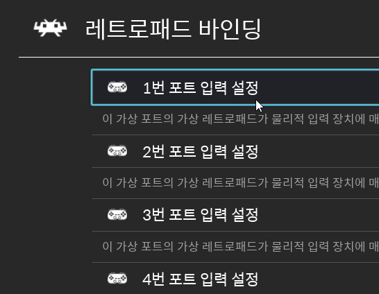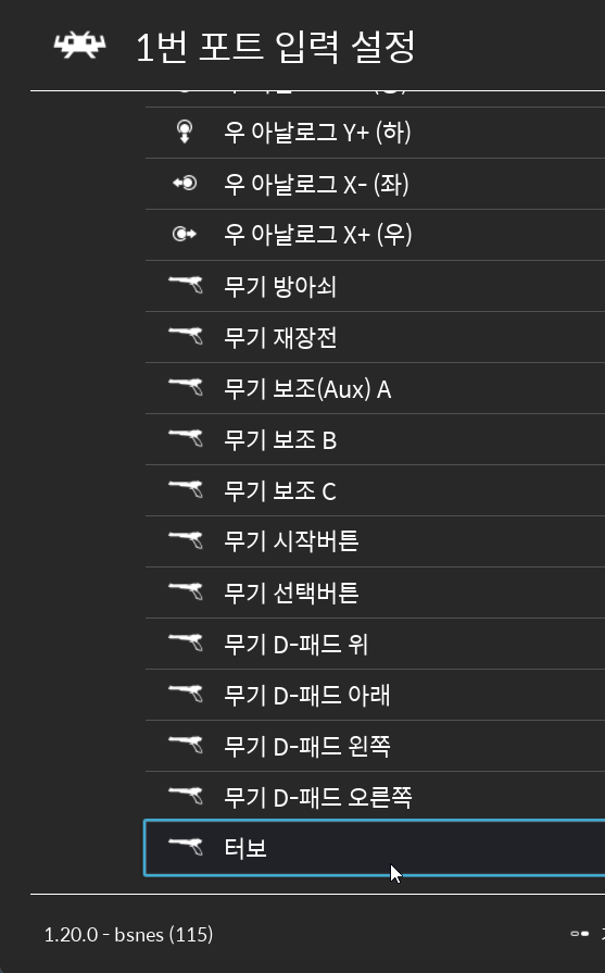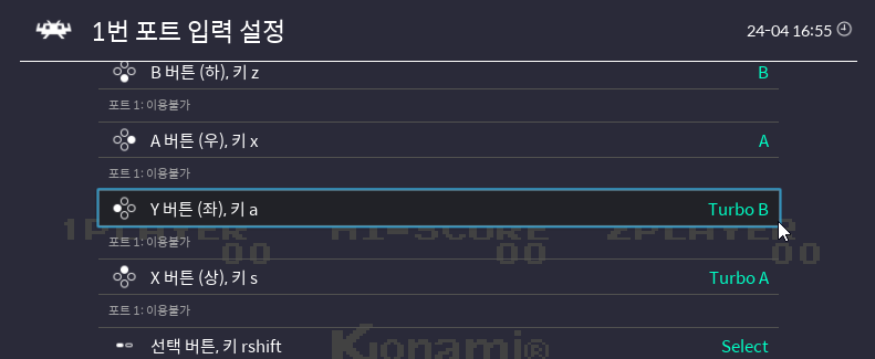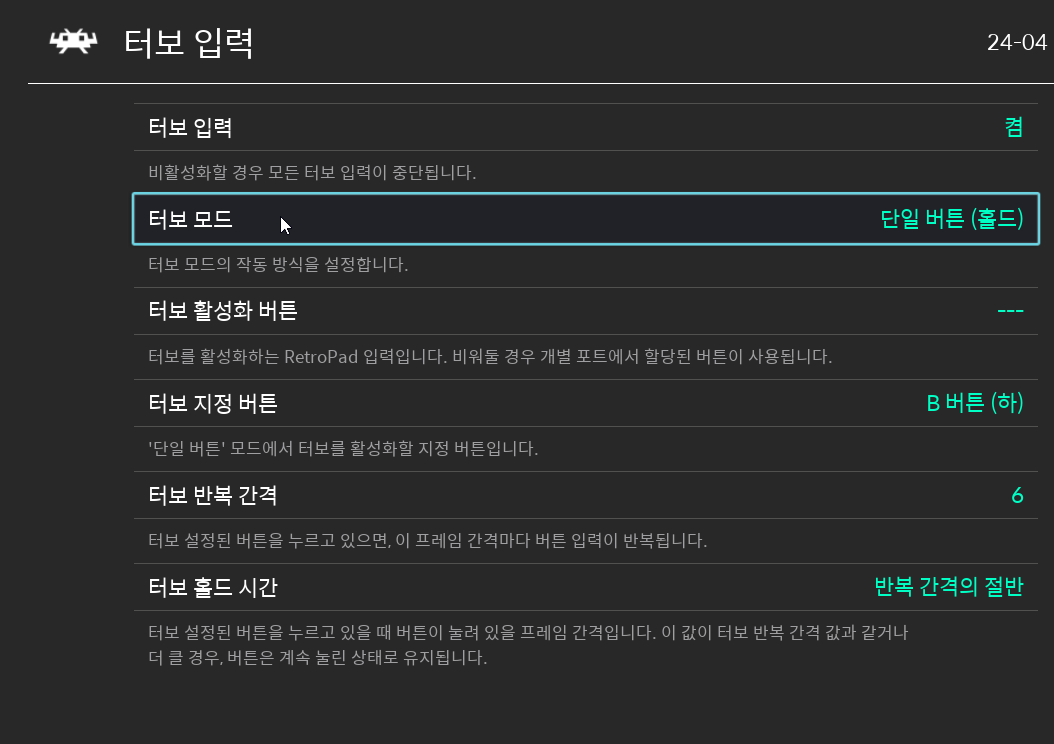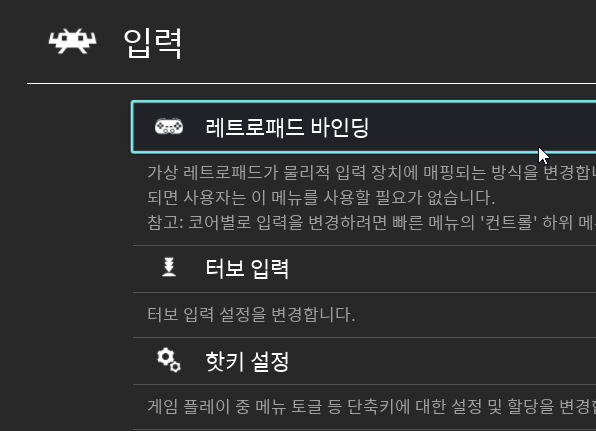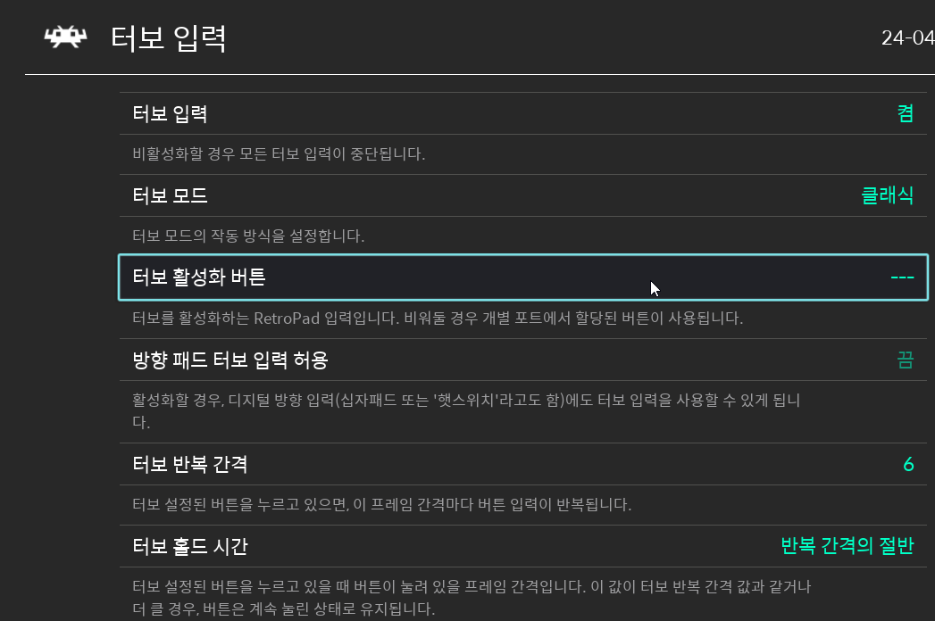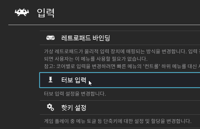 이는 입력의 '레트로패드 바인딩 → 1번 포트 입력 설정' 최하단에 있는 '터보' 메뉴에서 할당할 수 있습니다.