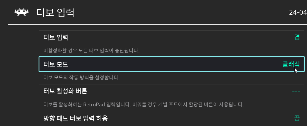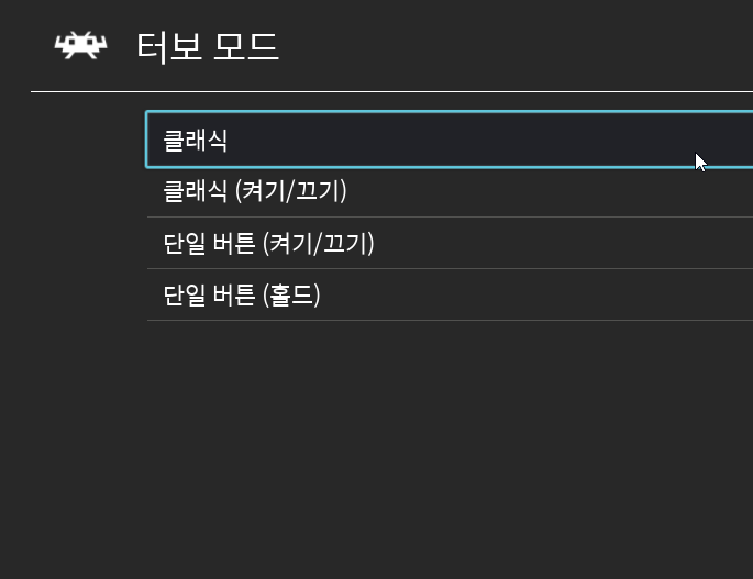 레트로아크에서 제공하는 터보 모드는 위와 같이 총 4가지인데 클래식과 단일 버튼의 가장 큰 차이는 터보 입력을 하나의 버튼만 지원하는지, 하나 이상의 버튼을 지원하는가의 차이입니다.