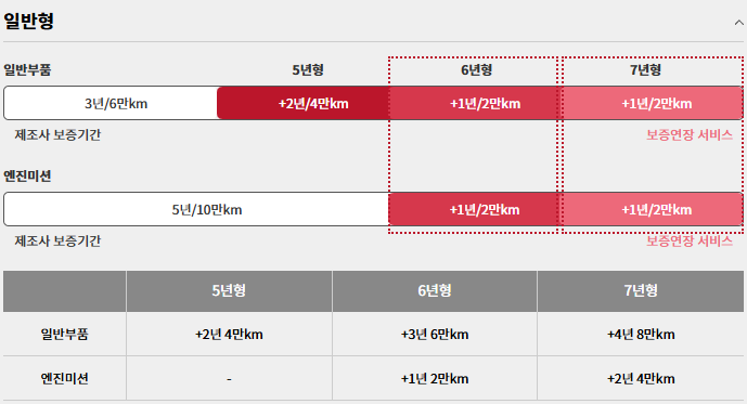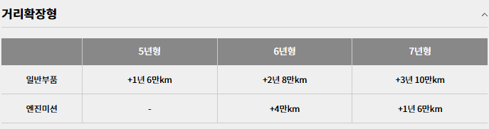 일반형은 7년 14만 km까지, 거리확장형은 6년 16만 km, 기간확장형은 8년 12만 km까지입니다.