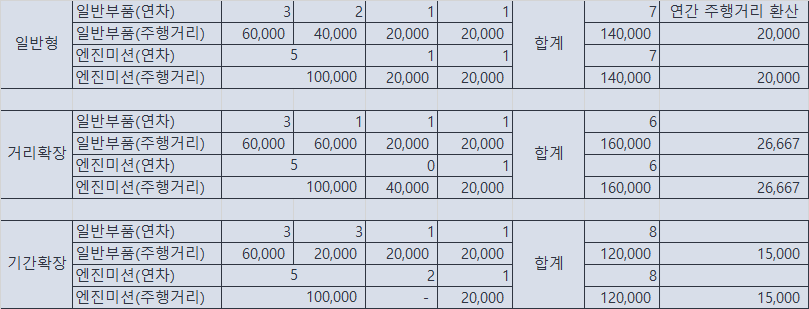 보증거리를 보증기간으로 나누어 연간주행거리로 환산해 보면 일반형은 연 2만 km, 거리확장형과 기간확장형은 각각 연 26.667km, 만 오천 km가 나옵니다.