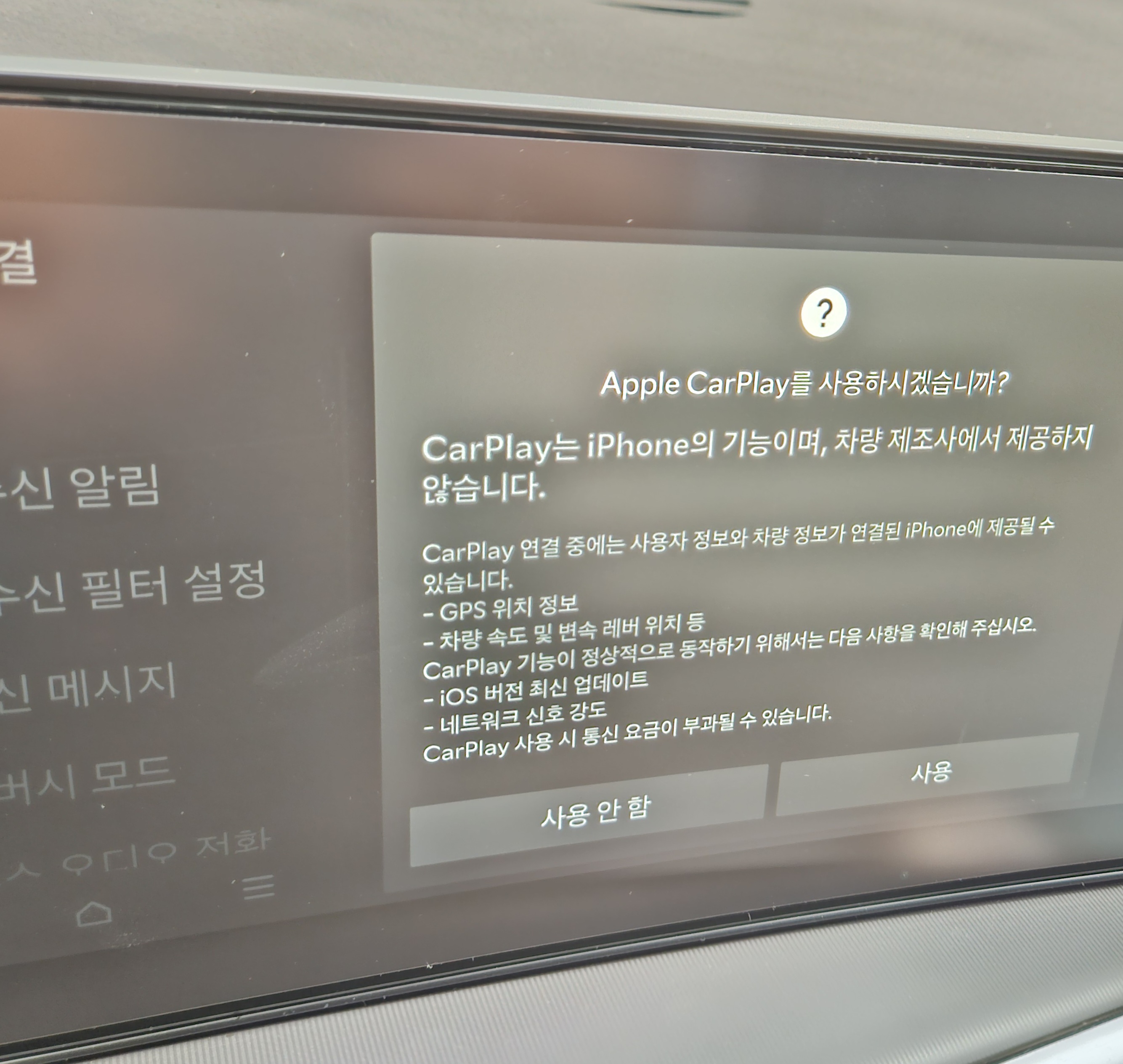 차량에서 유선 카플레이 기능을 활성화해 둔 후 기기를 연결하면 위와 같이 차량에서 애플 카플레이를 인식합니다.