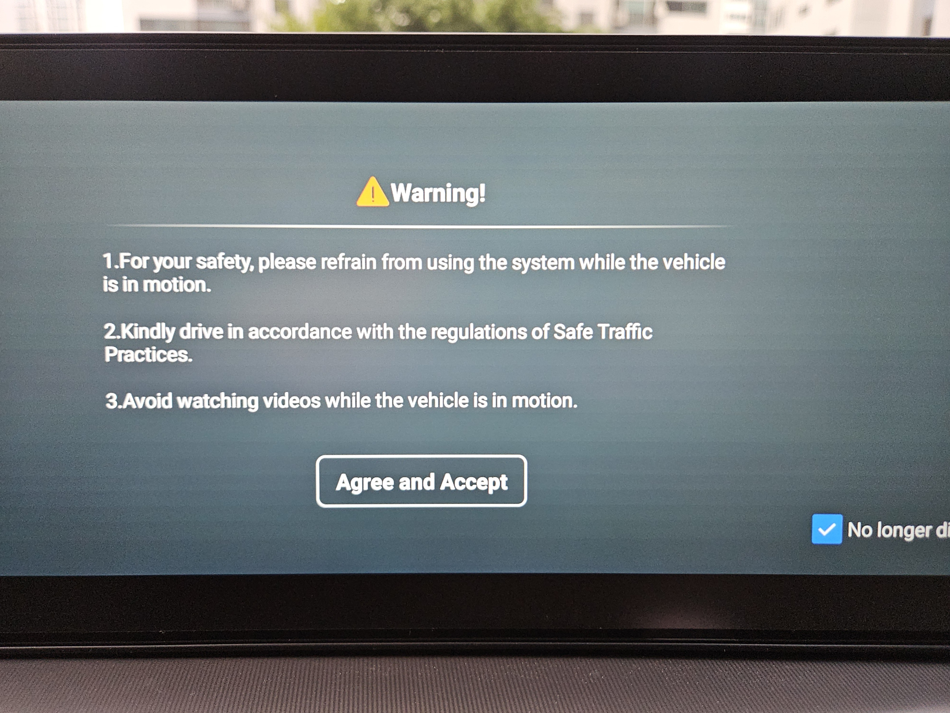 기기가 다시 켜지면 위와 같이 운전 중 영상시청을 주의하라는 안내문이 나오며 다시는 보이지 않게 설정할 수 있습니다.