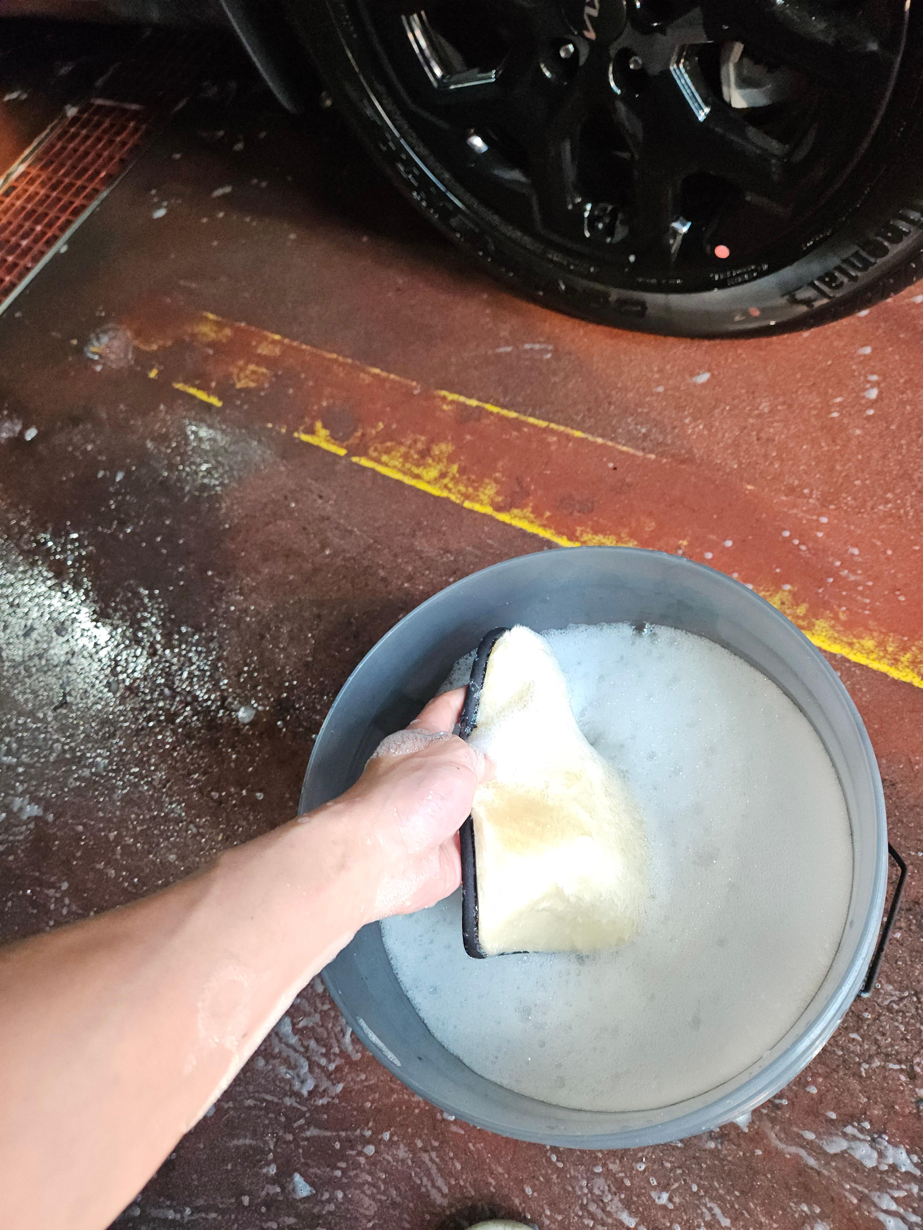 다음으로는 양동이에 그릿가드를 깔고 카샴푸를 적당량의 물과 섞어 거품을 낸 후 차량의 도장면을 닦아주면 됩니다.