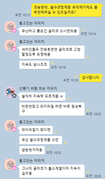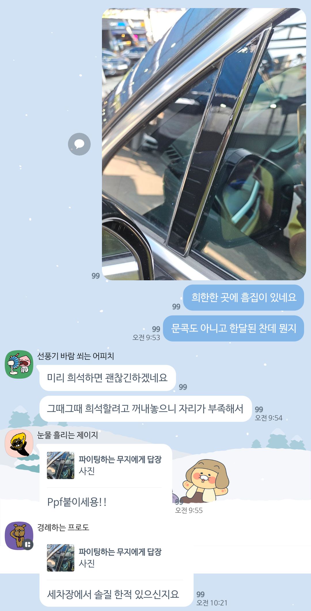 차량을 인수한 이후 최근에는 일주일 내내 비예보가 없는 날이 없었는데 비로소 다음 주에 비소식이 없어서 새 차를 세차를 할 요량으로 용품을 고르기 시작했는데... 웹 상의 바이럴도 거를 겸 아무래도 차량 관련 오픈카톡이다 보니 세차인들도 많아 도움이 될 거라는 판단에 접속되어 있는 쏘렌토 MQ4 카톡방에서 조언을 구했습니다.