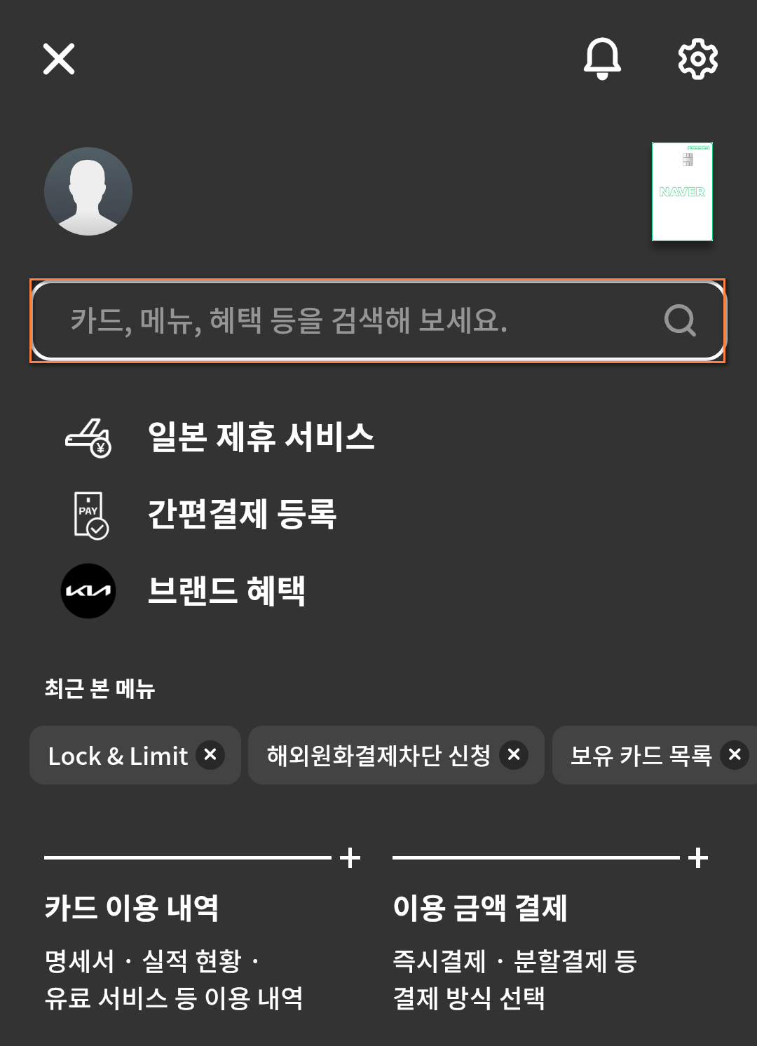 해외결제를 차단하기 위해 전체메뉴를 눌러 나오는 검색창에 '해외'를 입력하여 검색해 봅니다.