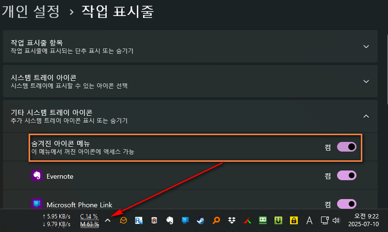 한 가지 좋은 점은 마이테마쩜넷 시절부터 꼴 보기 싫었던 작업표시줄의 더 보기 아이콘을 이제 숨길 수 있습니다.