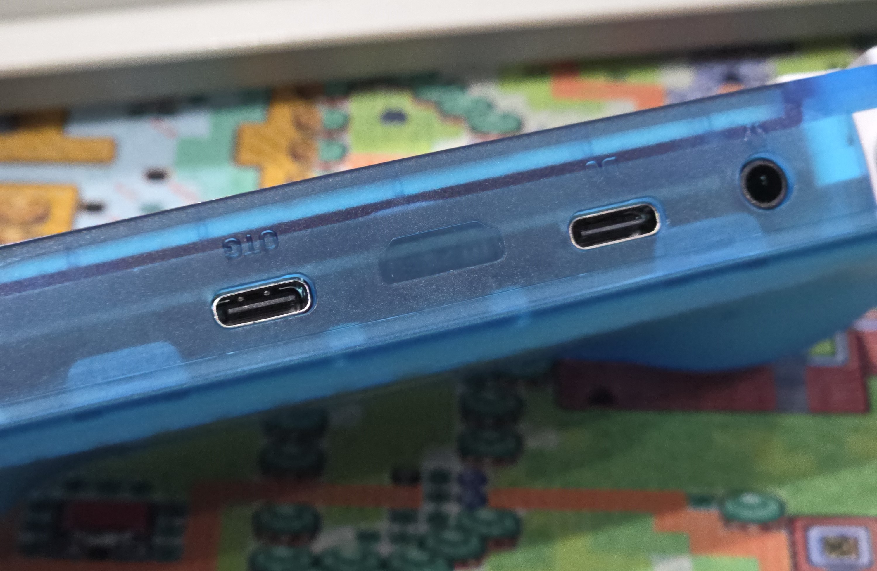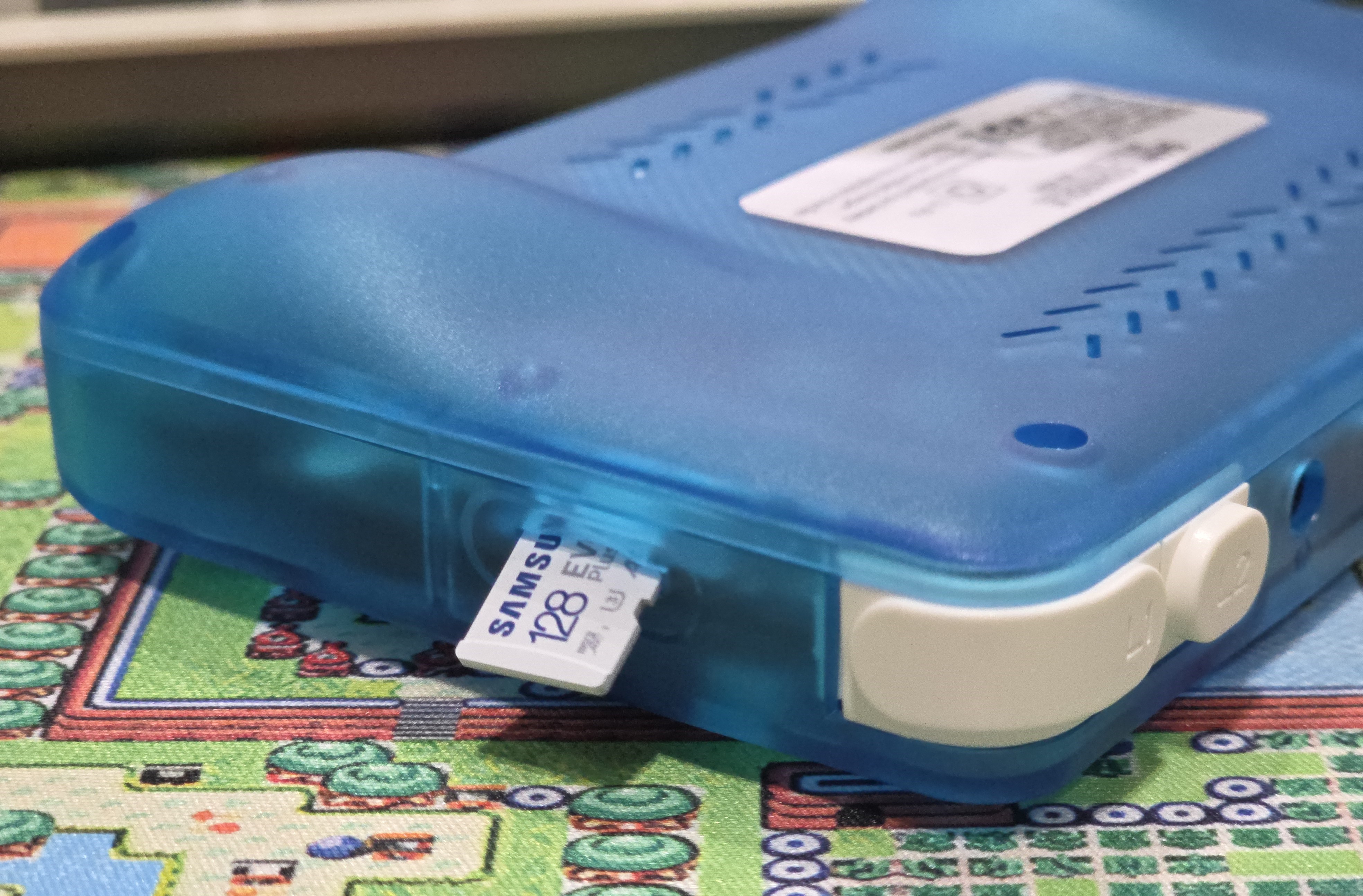 RK3326을 포함하여 이런류의 대부분의 짱겜기들은 2개의 SD 카드 슬롯을 지원하는 경우가 일반적인데, 이 제품은 하나의 SD 슬롯만 제공하며, 다른 기기들과 다르게 살짝만 방향성이 어긋나도 위 사진과 같이 메모리 카드가 SD 슬롯이 아닌 기기 내부로 들어가 버릴 수 있으니 SD 카드 삽입시 유의해야겠습니다.