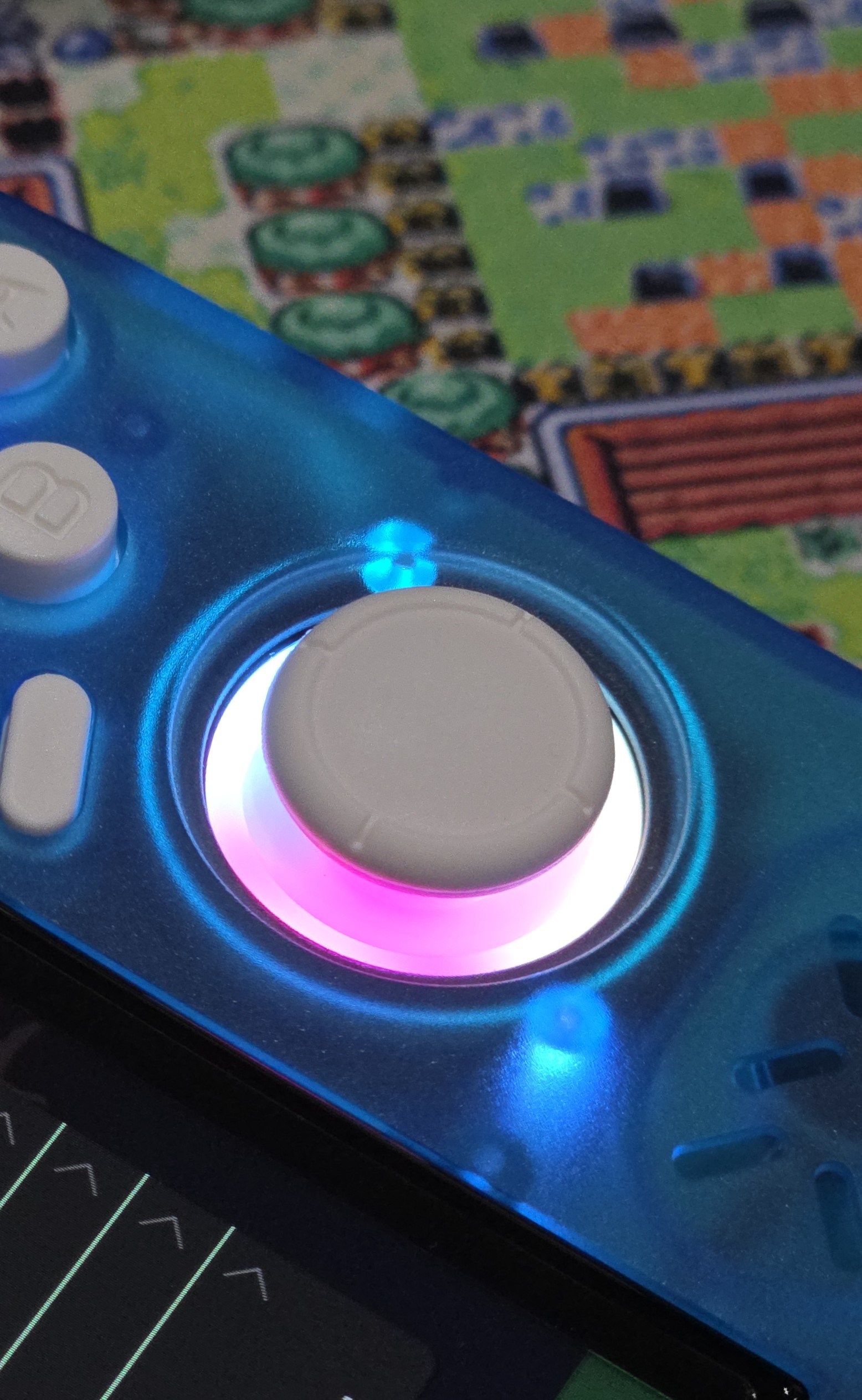 이로 인해 아날로그 스틱은 원래 위치해야 할 곳보다 더 위로 올라갔기 때문에 아날로그 스틱을 조작할 때는 스틱의 위치가 규브보다는 더 적당한 느낌입니다.