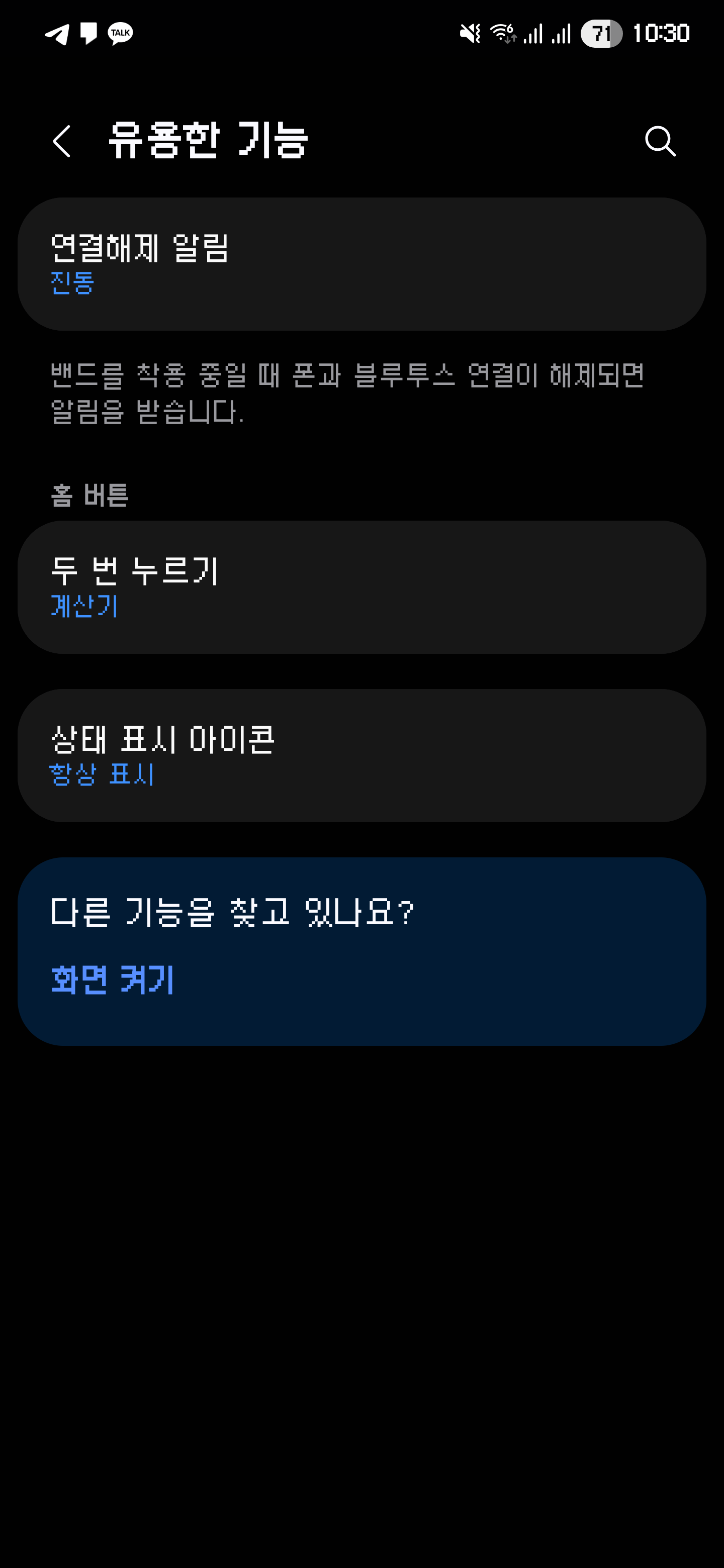 유용한 기능에서 '연결해제 알림' 기능을 활성화해 두면 폰을 놓고 이동하는 경우 알림이 오게 되므로 휴대전화의 분실 가능성을 조금 낮출 수도 있겠습니다.