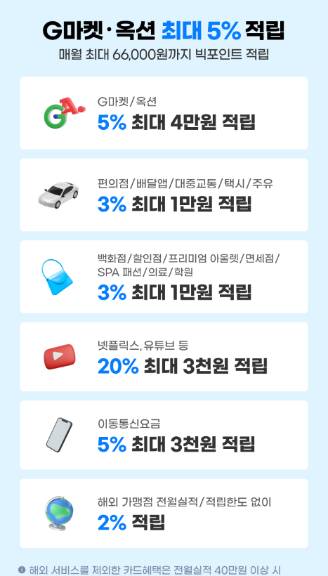 제가 현재 운용 중인 카드와 해당 카드로 할인이나 적립받는 영역은 위와 같은데 현재는 G마켓과 옥션을 할인받을 수 있는 카드가 없는 상태입니다.