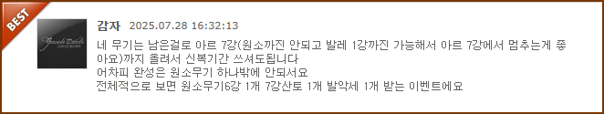 아무 생각 없이 받다 보면 저와 같이 무기는 이도저도 아닌 채로 실패하고 방어구는 확실하게 받을 수 있는 최대 방등의 방어구보다 낮은 아이템을 수령하게 되는 문제가 생길 수 있습니다.
