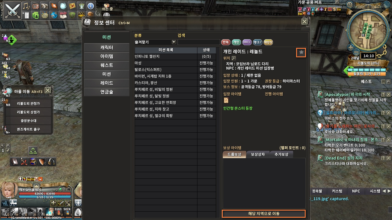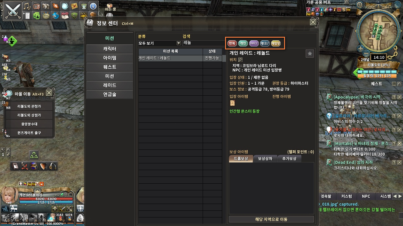 ※게임내에서 다양정보를 찾는법▶Ctrl + M을 누르면 캐릭터/아이템/퀘스트/미션/레이드에 대한 상세한 정보를 취득할 수 있음(허나 조금은 불편한 감이 없지않아 있기에.. 1순위로는 여길 찾아보