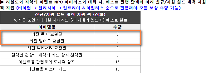 딜이 좋은 신캐릭터를 구하는 것과 별개로, 고급 장비 수급이 어려운 신복서버 특징상 최종 시나를 클리어할 수 있는 정도의 딜까지는 나오는 리전 무기와 방어구를 획득하기 위해 바이런의 '새 시대의 인도자' 시나리오 퀘스트를 빠르게 진행하는 것도 아주 중요합니다.