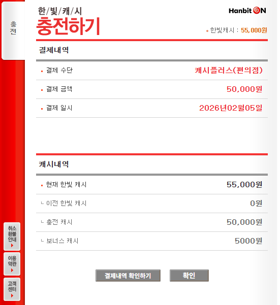 보너스 캐시 10%를 포함하여 55,000원이 제대로 충전되었습니다.