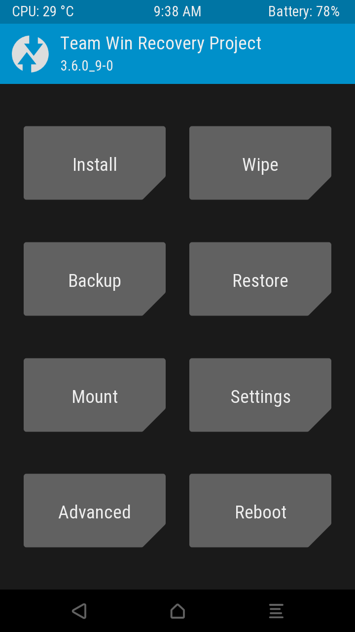 이후 기기의 전원이 꺼진 상태에서 '음량 감소+전원 버튼'을 길게 누르고 있으면 TWRP 리커버리로 진입합니다.