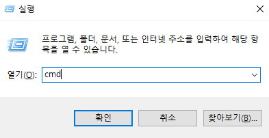 'Win + R' 키를 눌러 열리는 실행창에서 'cmd'를 입력하고 '확인'을 누릅니다.