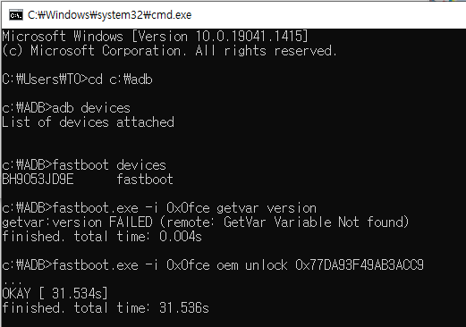fastboot.exe -i 0x0fce oem unlock 0x아까받은언락코드