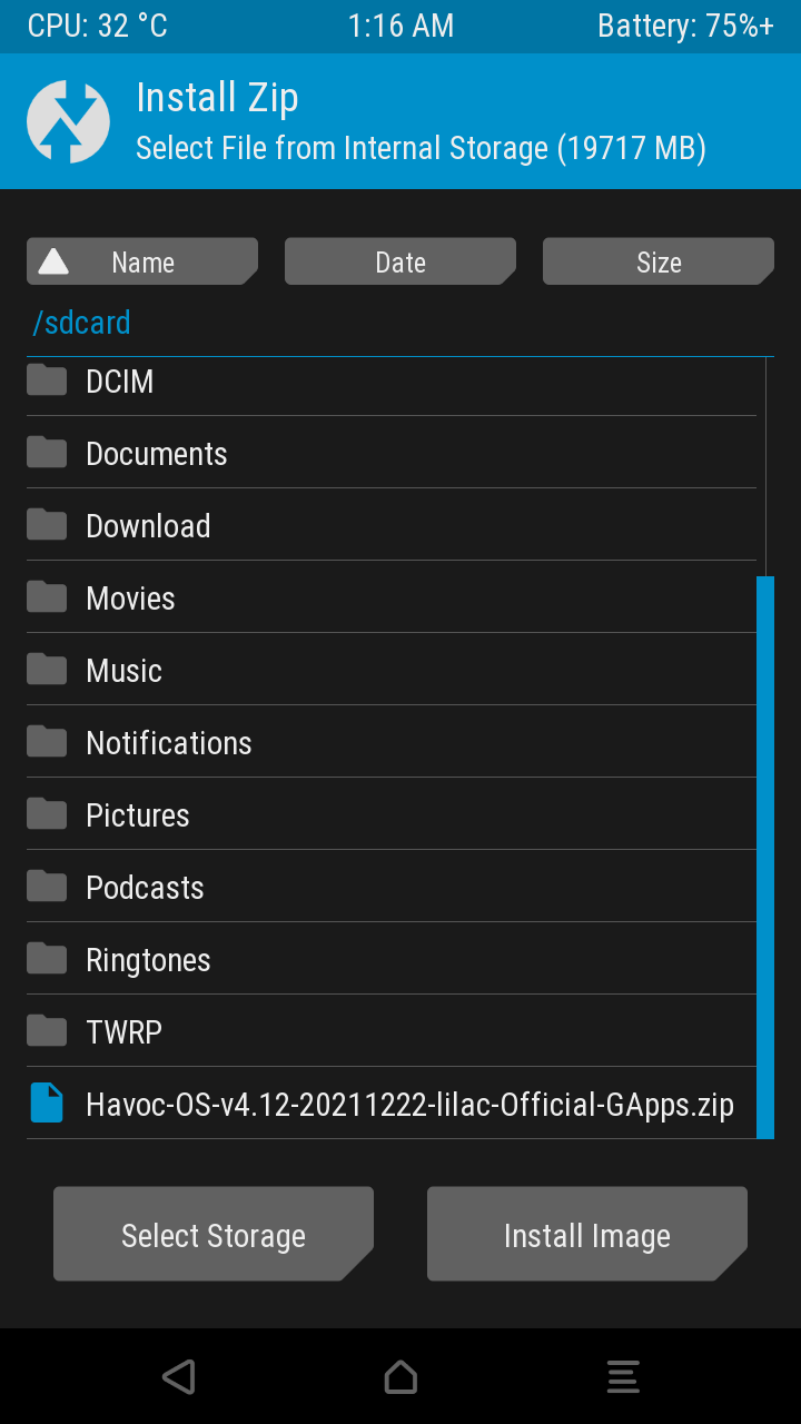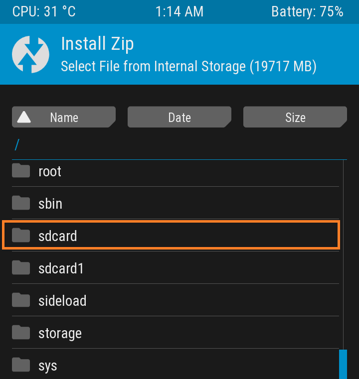 이후 메인 메뉴에서 'Install' 항목을 선택하면 위와 같은 창이 뜨는데, 좀 전에 MTP로 롬파일을 넣은 xz1c의 내장 메모리 경로는 강조된 'sdcard'입니다. 터치하여 내장 메모리로 진입합니다.