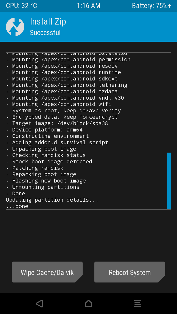 부트로더가 언락 되는 시점에 순정 롬파일이 파괴되어 xz1c는 벽돌이 되었으나 '음량 감소+전원 버튼'을 계속 누르고 있으면 강제 재부팅되면서 TWRP로 진입합니다.