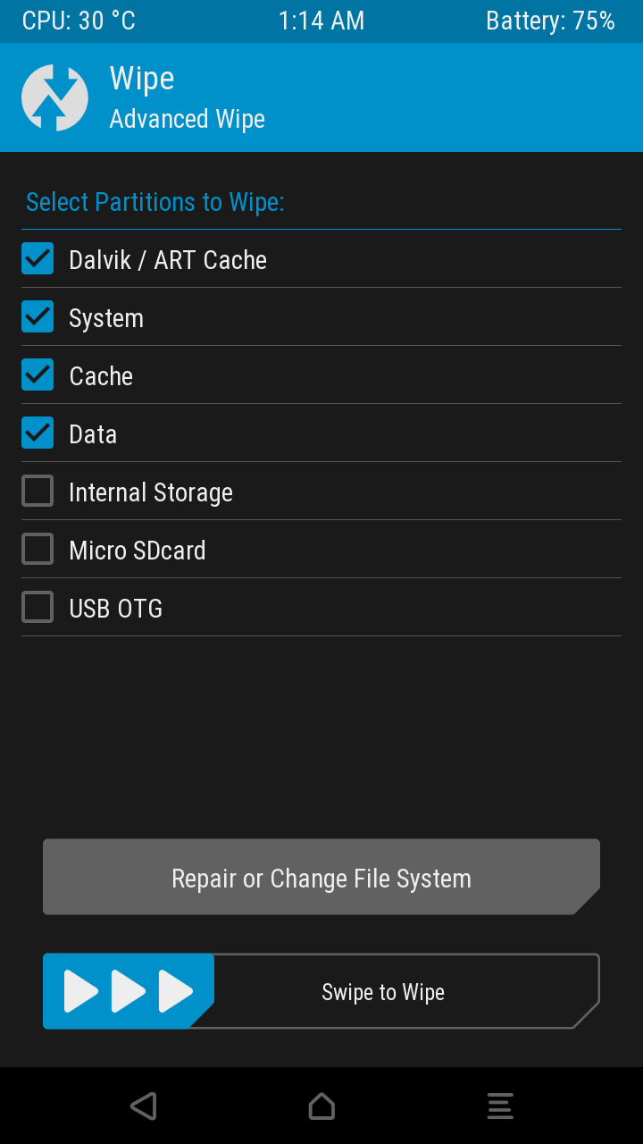 다시 메인 메뉴에서 'Wipe' 항목으로 들어간 후 스와이프 하지 않고 'Advanced Wipe'를 선택합니다.